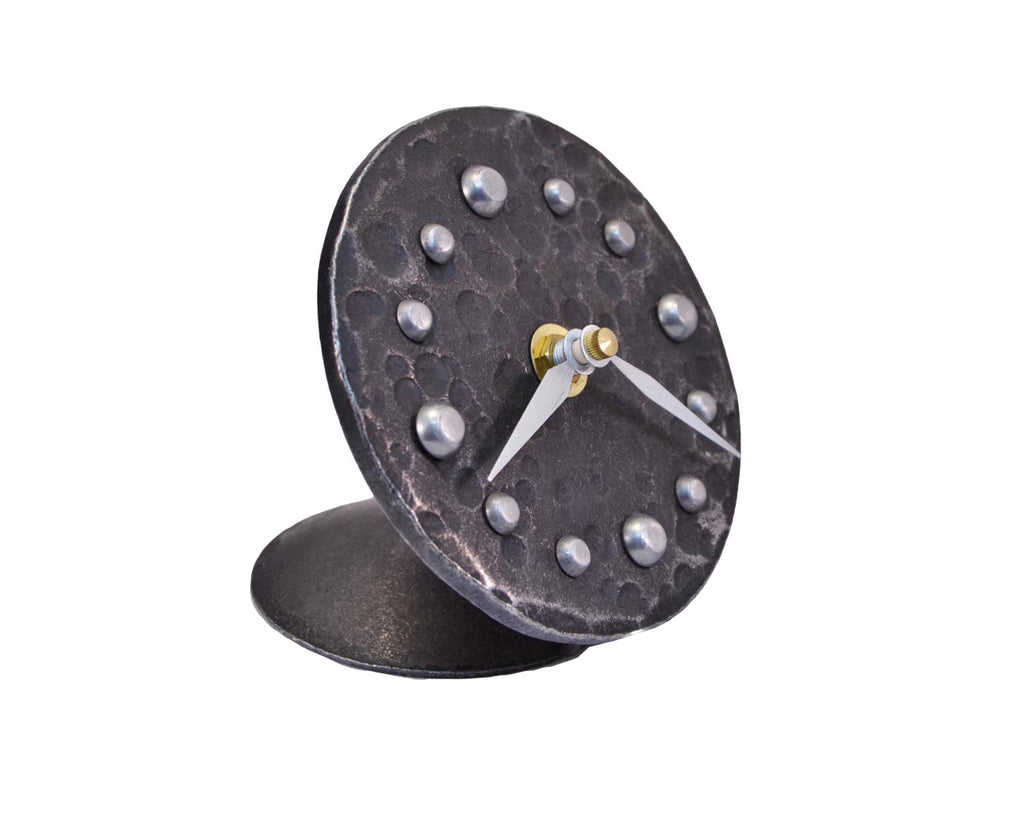 This hand-forged desk clock by Blackthorne Forge is a perfect union of function and sculpture. Combining traditional ironwork with contemporary design, the clock adds a rustic modern feel to any space. Made of iron (natural oiled-metal finish) with steel rivets. Measures 4.5" diameter. Handcrafted in US. Includes a battery operated quartz mechanism . Battery not included.