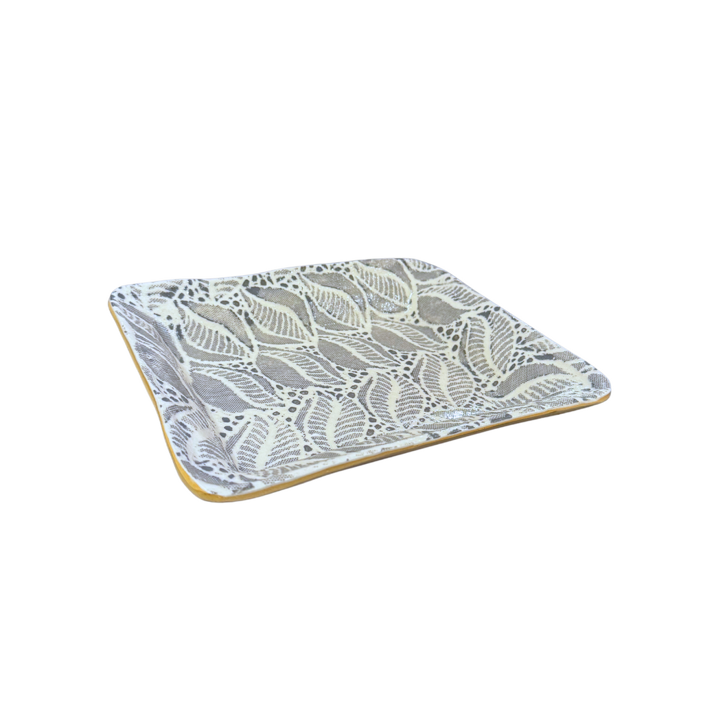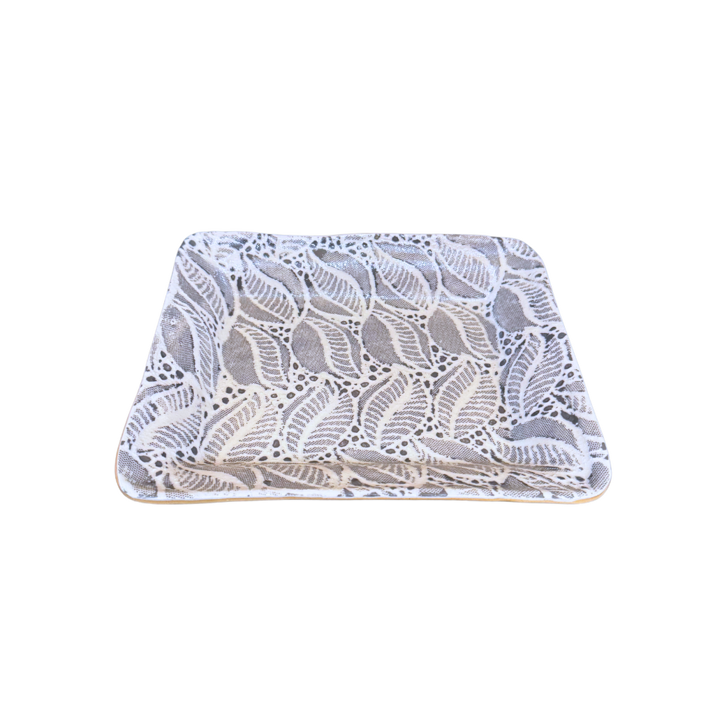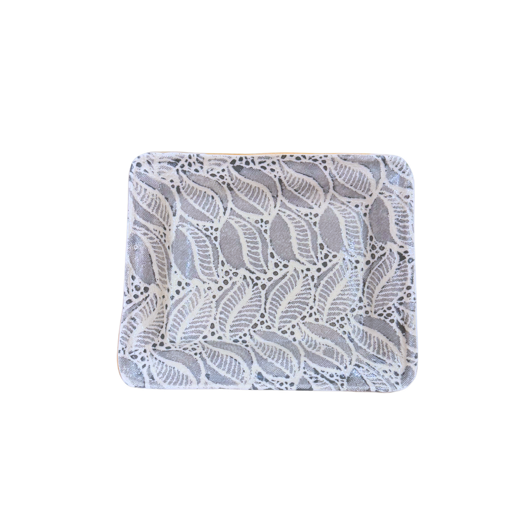 Alive with color and texture, this ceramic dish is as functional as it is beautiful. Using fabric and lace as a stencil to create the pattern in the rich color of charcoal, the dish is ideal for every day use and will add to your decor. With bold patterns and colors, mix and match with other dinnerware for a unique table setting! Dishwasher safe. Measures 9.5 x 8 inches and 1.5 inches deep. Made in the US.