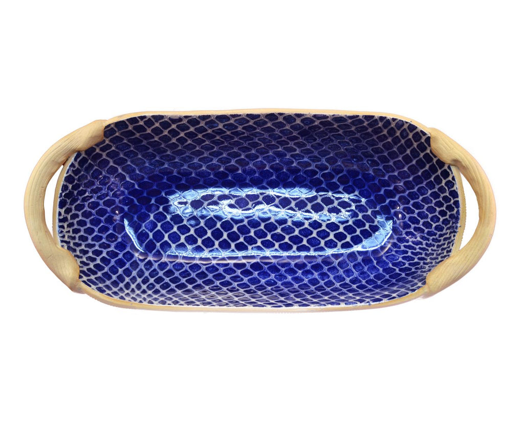 Alive with color and texture, this ceramic bread basket by Terrafirma is functional as it is beautiful. Using fabric and lace as a stencil to create the pattern in the color cobalt, the bread basket is ideal for every day use. With bold patterns and colors, mix and match with other dinnerware for a unique table setting! Dishwasher safe. Measures 13.5 x 6 x 3 inches. Handcrafted in the US.