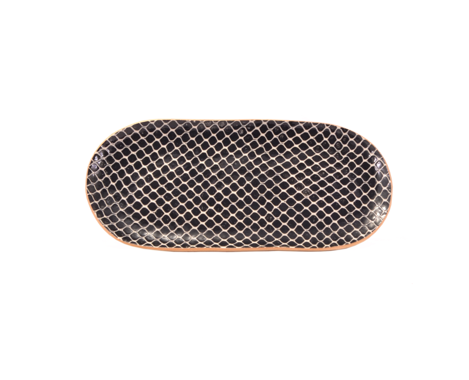 Alive with color and texture, this ceramic tray by Terrafirma is functional as it is beautiful. Using fabric and lace as a stencil to create the pattern in black color, the tray is ideal for every day use. With bold patterns and colors, mix and match with other dinnerware for a unique table setting! Dishwasher safe. Measures 14.5” x 6.5”. Made in the US.