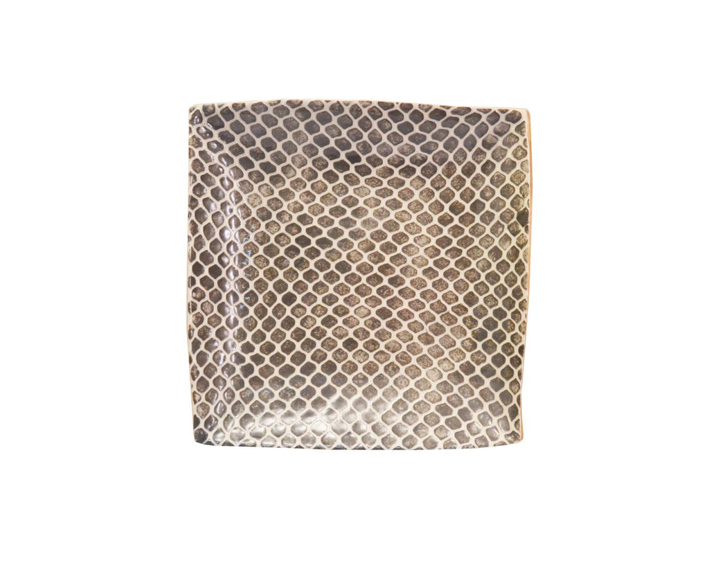 Alive with color and texture, this ceramic square by Terrafirma is as functional as it is beautiful. Using fabric and lace as a stencil to create this raj pattern in the rich color of charcoal, the square is ideal for every day use and will add to your decor. With bold patterns and colors, mix and match with other dinnerware for a unique table setting! Dishwasher safe. Measures 9”. Made in the US.