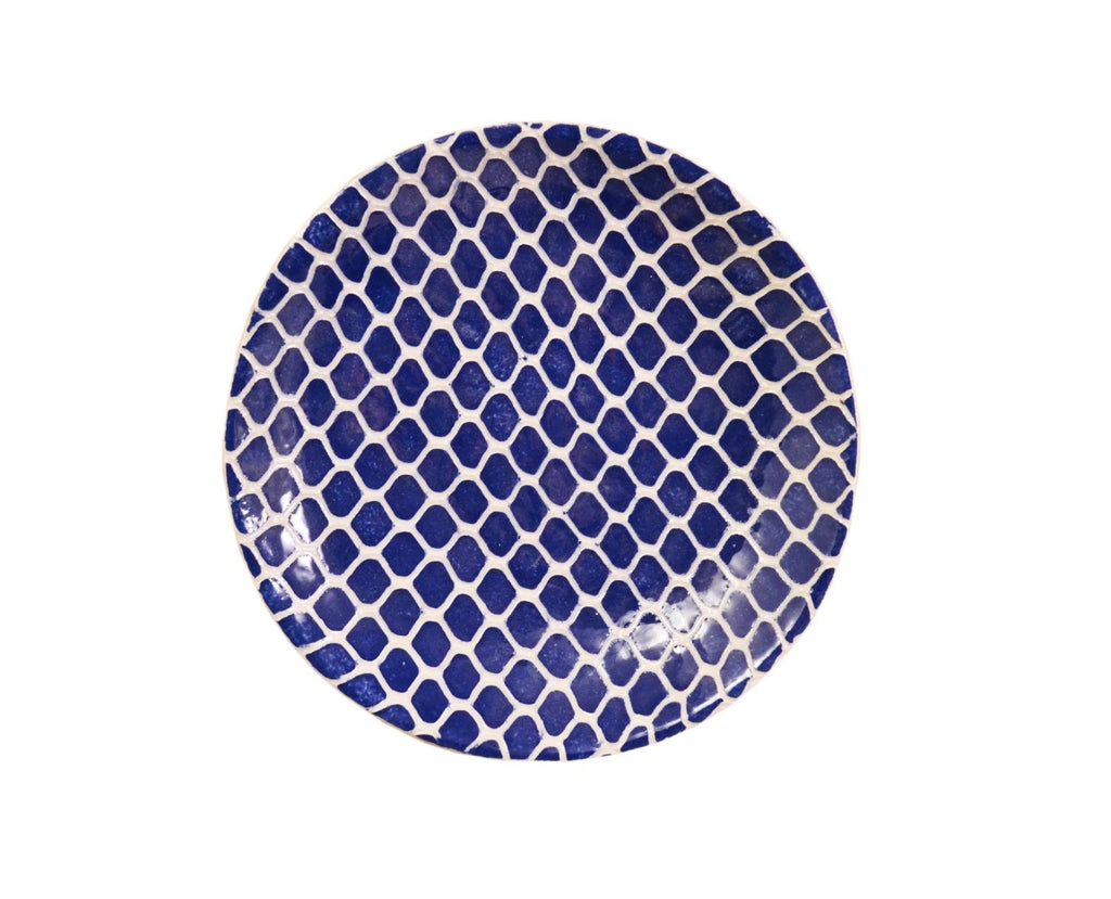 This ceramic oil dip dish by Terrafirma is functional as it is beautiful. Using fabric and lace as a stencil to create a gorgeous pattern, this cobalt shallow dish with a Taj Mahal inspired pattern is great for everyday use and for entertaining. Enhance your table and combine with other pieces by the artist for a unique table setting! Dishwasher safe. Measures 6.5”. Handmade in the US.