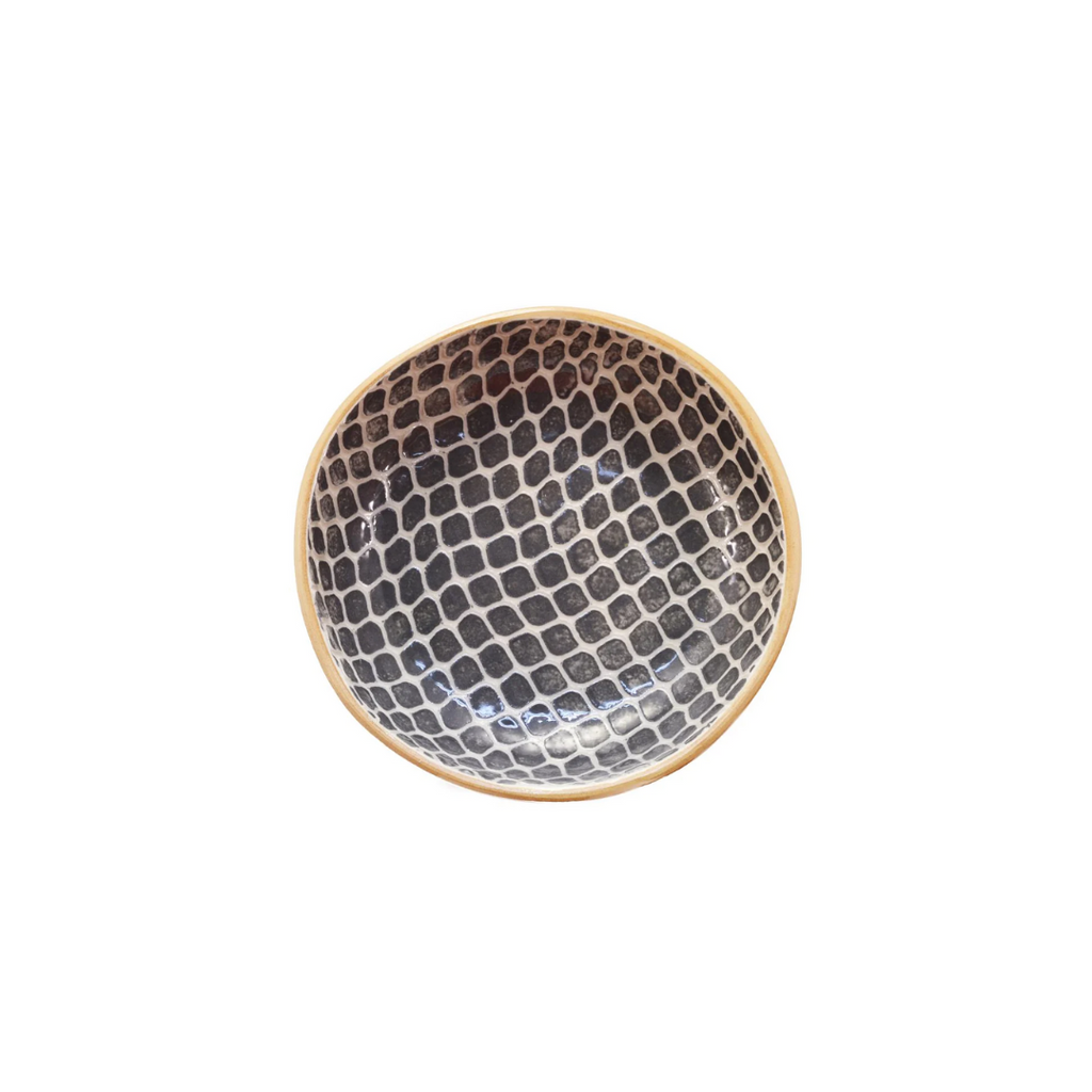 Alive with color and texture, this ceramic bowl by Terrafirma is functional as it is beautiful. Using fabric and lace as a stencil to create the pattern in the color charcoal, the bowl is ideal for every day use. With bold patterns and colors, mix and match with other dinnerware for a unique table setting! Dishwasher safe. Measures 6.5 inches in diameter. Handcrafted in the US.