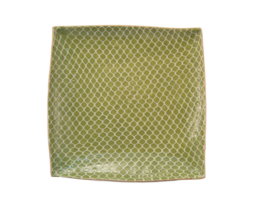 Alive with color and texture, this ceramic platter by Terrafirma is functional as it is beautiful. Using fabric and lace as a stencil to create the patterning in citrus color, the platter is ideal for every day use. With bold patterns and colors, mix and match with other dinnerware for a unique table setting! Dishwasher safe. Measures 11.25 inches. Made in the US.
