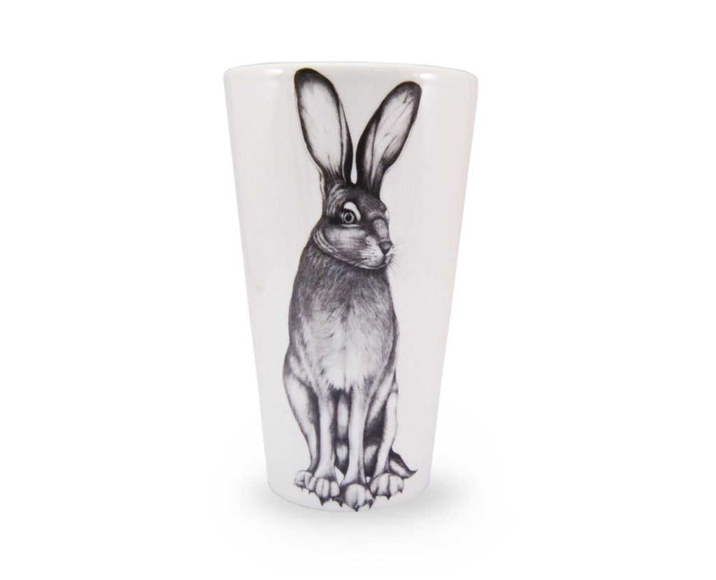 Welcome to the charm and serenity that is nature into your home with a beautiful Laura Zindel piece! Both functional and decorative, this tumbler adorns the artist's original illustration of a hare. Made from high-resistance white china. Measures 6 inches tall. Handcrafted in US. Can be placed in the microwave and dishwasher.