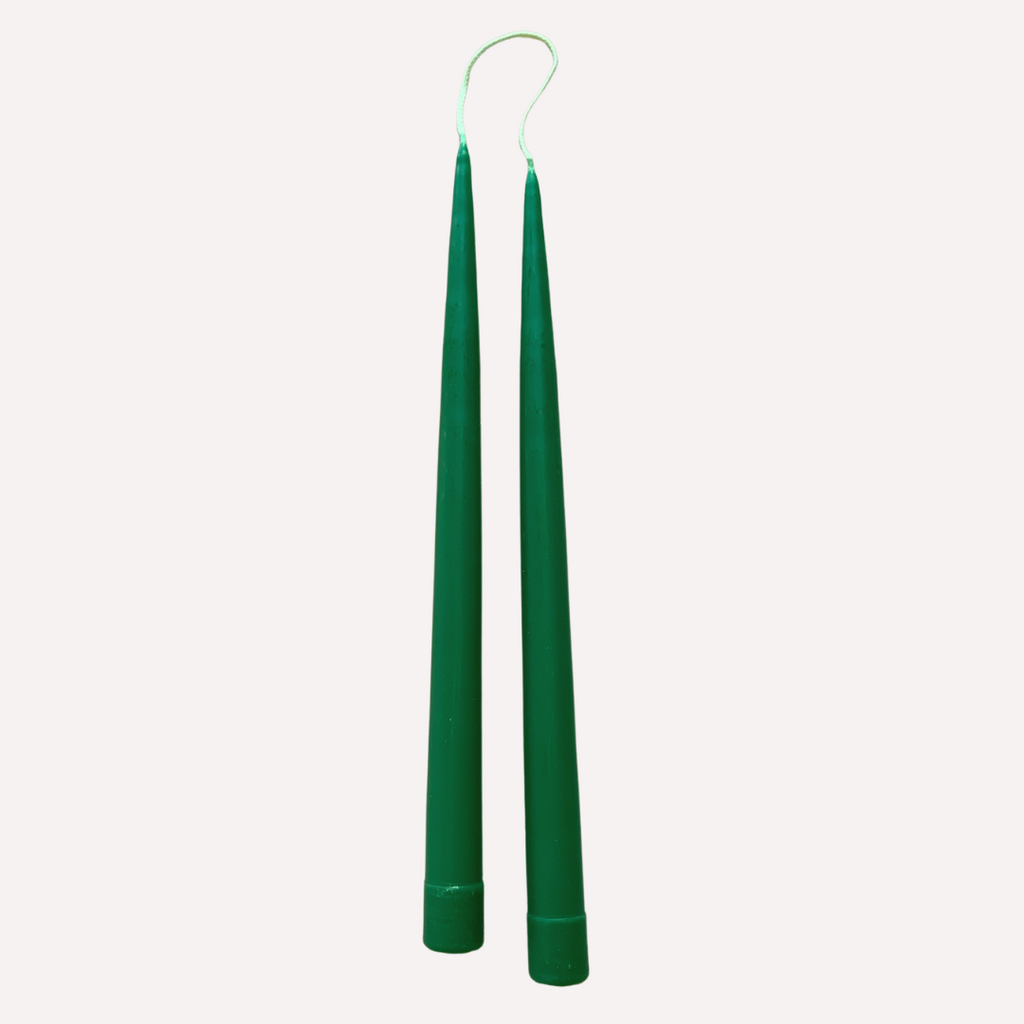 Combining old-world techniques with a blend of beeswax, other premium waxes and dyes, Danica Design creates hand-dipped candles in an array of colors. Unscented and solid color throughout, each candle is dipped 50 times for color depth and consistency. The tapered candles measure 13" in length and 7/8" at the base and have a burning time of approximately 11 hours. The candles are both smoke and drip free. The candles are sold by the pair with a joined wick. Handmade in US.