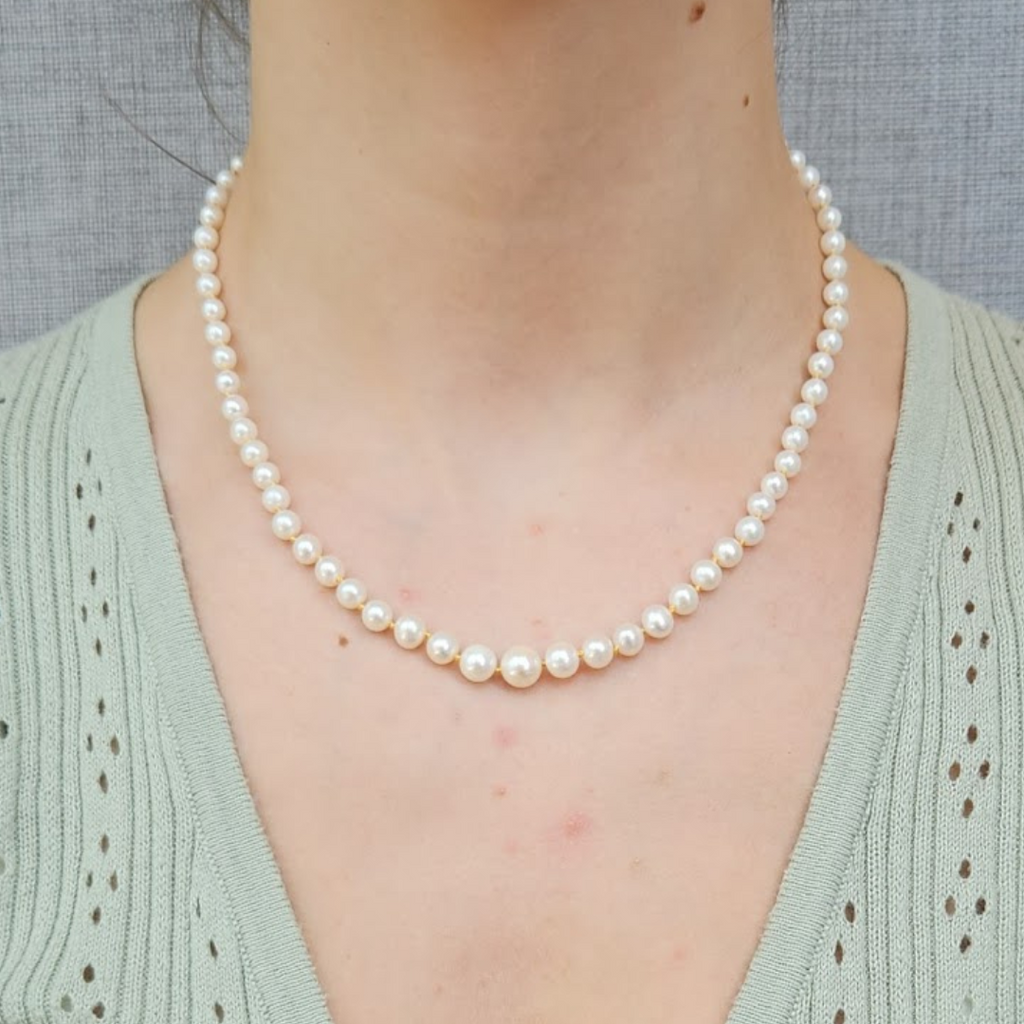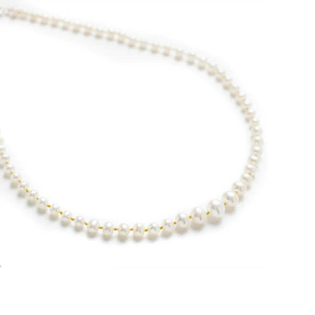 A classic tapered pearl strand with a surprising pop of color! This pearl necklace by Johanna Brierley Jewellery Design is made with freshwater pearls knotted on yellow polyester cord. The length is 18" and features a sterling silver spring ring clasp.