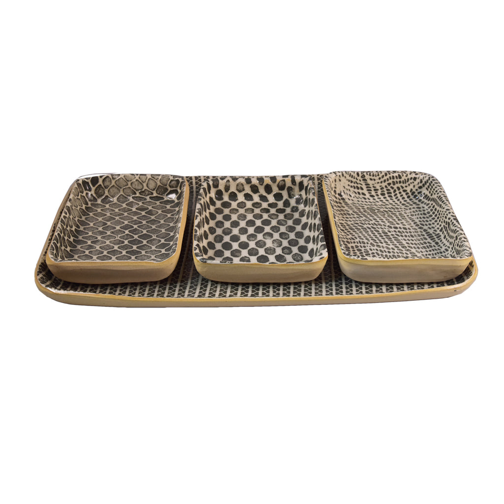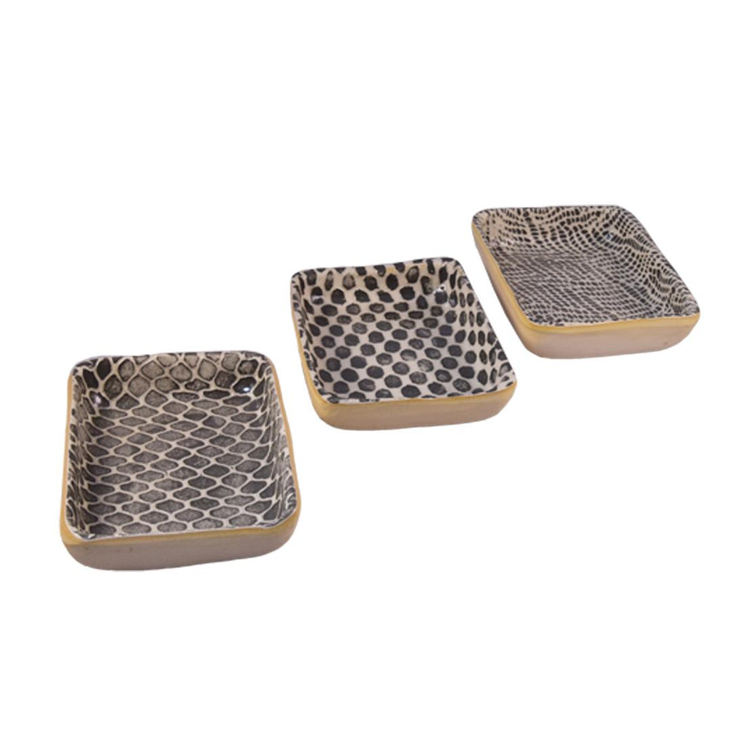 Alive with color and texture, this ceramic trio set by Terrafirma is functional as it is beautiful. These rectangular dip bowls are created using fabric and lace as a stencil to create the patterns Taj, Dot, and Braid in charcoal color. With bold patterns and colors, mix and match with other dinnerware for a unique table setting! Goes well with the Tasting Tray (sold separately)! Dishwasher safe. Each bowl measures 5.75" x 4.5" x 1.25". Made in the US.
