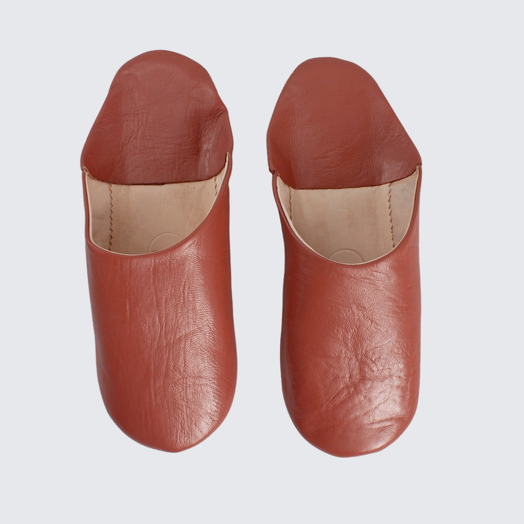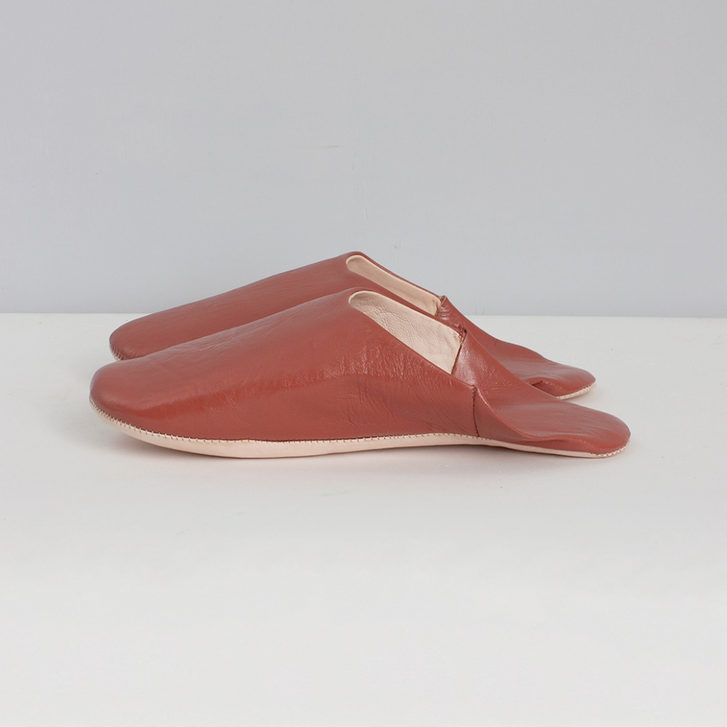 These Bohemia Design slippers are made by a team of highly skilled craftsmen in a family run workshop in Marrakech using traditional techniques. Made of terracotta dyed leather and size medium (US 7-8.5). Handmade from the finest quality hides, the leather is cured using organic processes, which may leave a residual scent that will fade once they have had a chance to air out. The leathers are dyed and dried in the sun before being stitched. Minor flaws and imperfections are characteristic of natural materials and traditional methods. CARE: These leather soled slippers are designed for indoor use on smooth, dry surfaces and are not suitable for outdoor or poolside wear. We recommend cleaning your babouche with a dry or slightly damp cloth keeping use of water to an absolute minimum.