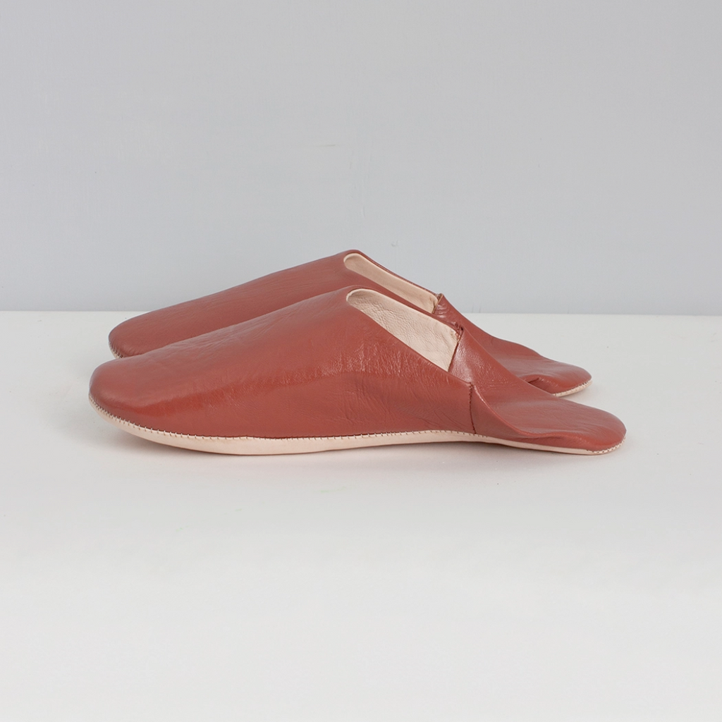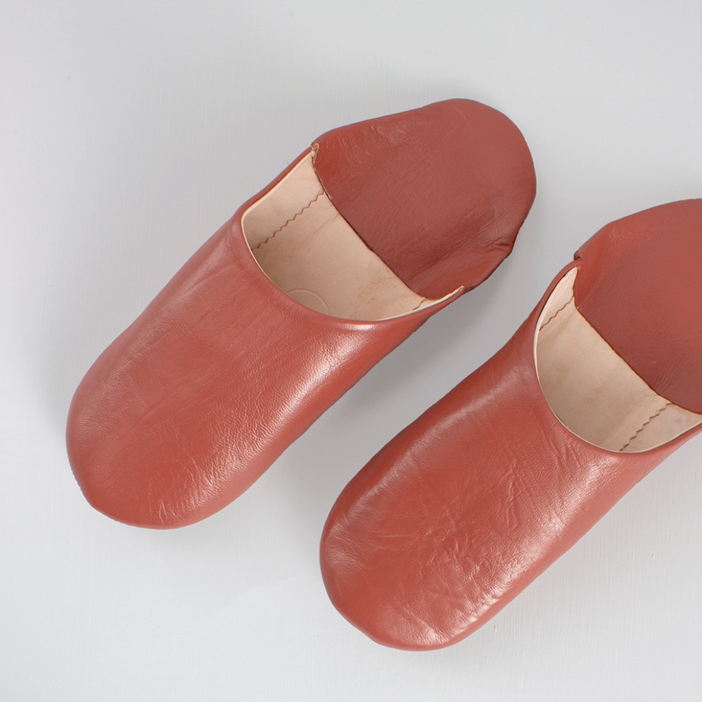 These Bohemia Design slippers are made by a team of highly skilled craftsmen in a family run workshop in Marrakech using traditional techniques. Made of terracotta dyed leather. Size small (US 4-6.5). Handmade from the finest quality hides, the leather is cured using organic processes, which may leave a residual scent that will fade once they have had a chance to air out. The leathers are dyed and dried in the sun before being stitched. Minor flaws and imperfections are characteristic of natural materials and traditional methods. CARE: These leather soled slippers are designed for indoor use on smooth, dry surfaces and are not suitable for outdoor or poolside wear. We recommend cleaning your babouche with a dry or slightly damp cloth keeping use of water to an absolute minimum.