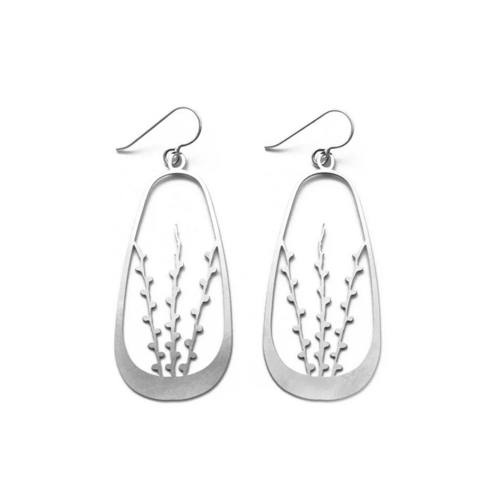 Redolent of shapes and patterns found in nature and in textiles, these earrings by Daphne Olive are elegant, yet bold and fun to wear. Made of stainless steel with sterling silver ear wires, these earrings measure 2.81” x 1.00”. Handcrafted in US.