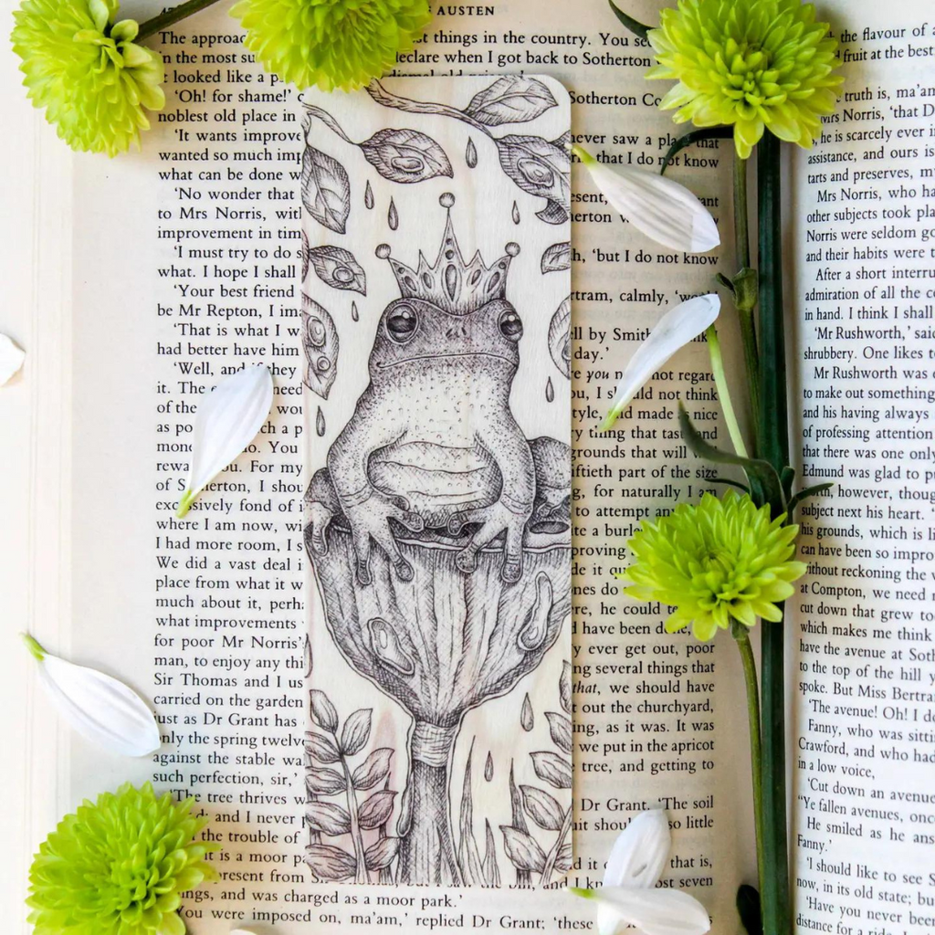 Let the magical world of Mackenzie Myrick's illustrations mark your book page! Made of 100% poplar wood, this bookmark features the artist's whimsical drawing of a frog prince. Measures 2" x 6" and 0.025 mm thick. With rounded corners. Comes in a protective clear sleeve. Handmade in the US.