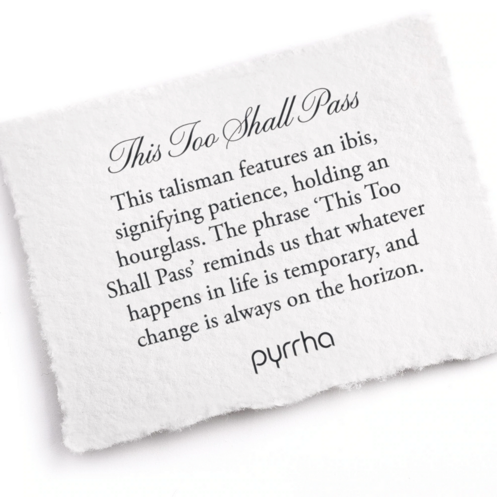 Cast using authentic wax seals and imagery from the Victorian Era, Pyrrha talismans are designed to inspire the wearer with its heralded meaning. This talisman features an ibis, signifying patience, holding an hourglass. The phrase ‘This Too Shall Pass’ reminds us that whatever happens in life is temporary, and change is always on the horizon. Made of 100% recycled sterling silver, the pendant measures 0.86" x 0.75". The chain is 18". Comes with a meaning card. Handcrafted in Vancouver, Canada.