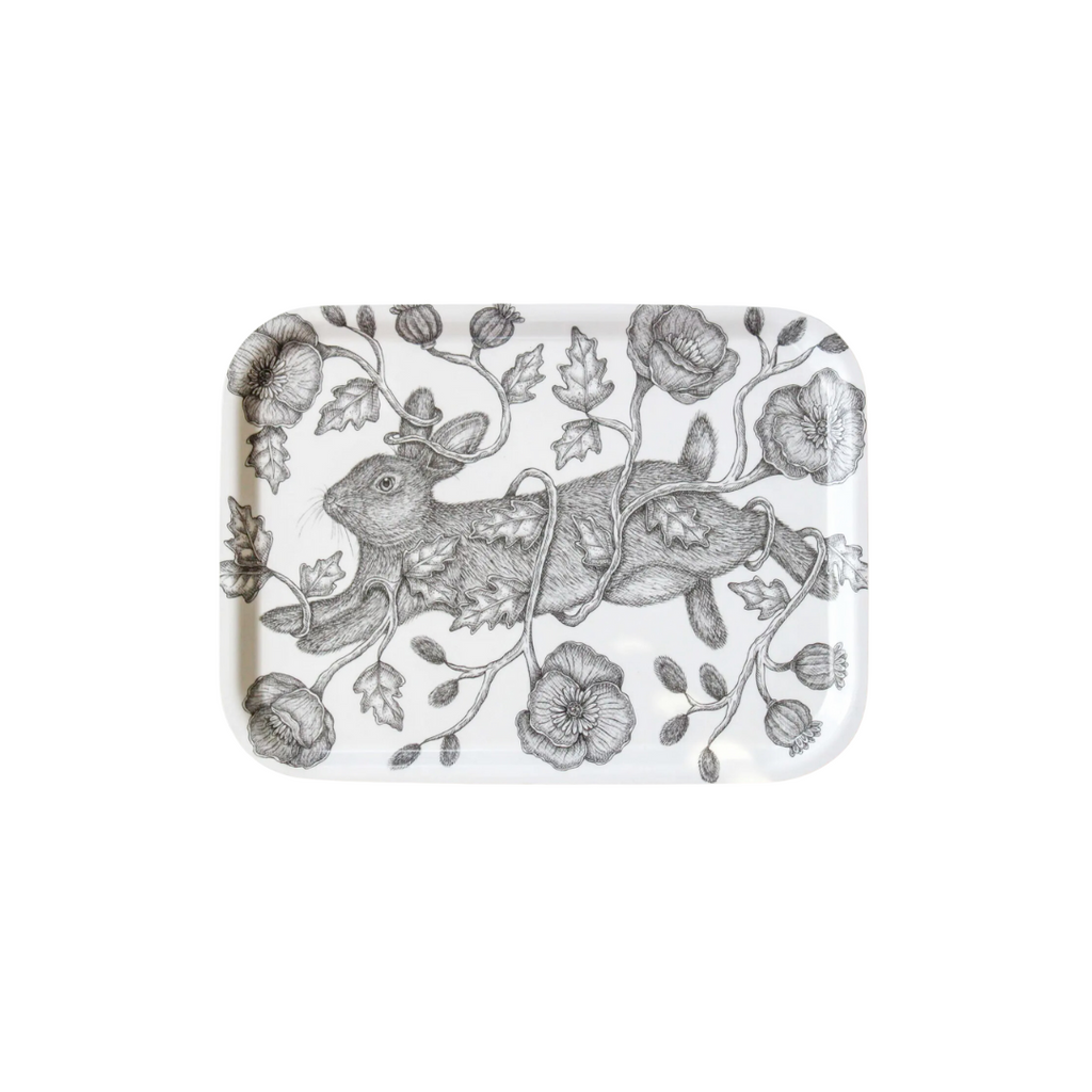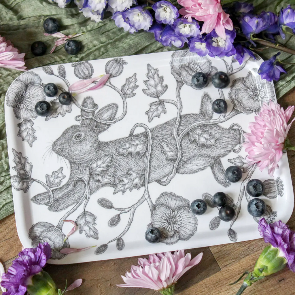 Let the magical world of Mackenzie Myrick's illustrations adorn your home! Made of sustainable birch wood, this tray features the artist's drawing of a cute rabbit jumping through the poppies. Perfect size for serving snacks or keeping track of small things like jewelry and keys. The tray measures 8" x 10" and is both food and dishwasher safe.