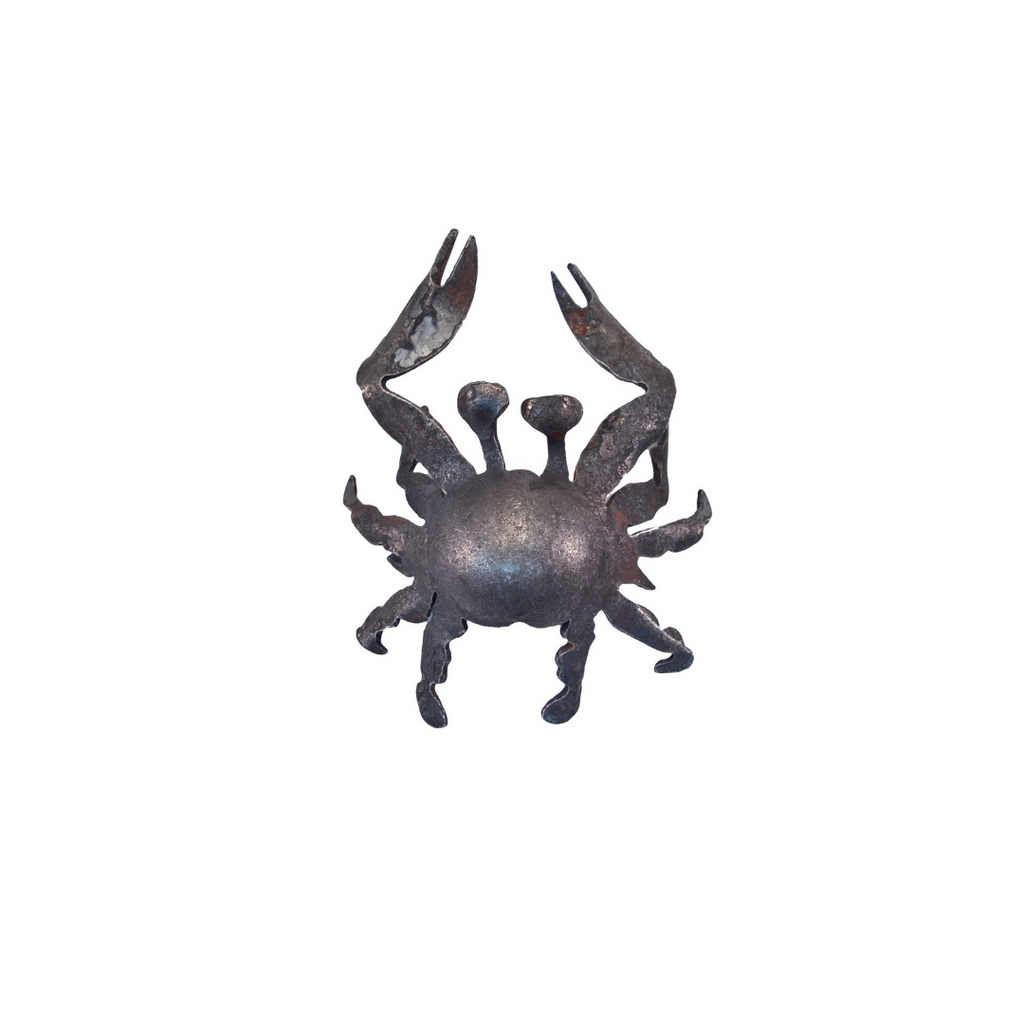 This hand-forged tiny crab by Blackthorne Forge is a sight to behold! Combining traditional ironwork with contemporary design, the crab will add a rustic modern feel to any space. Made of iron (natural oiled-metal finish). Measures 5 inches tong by 4.25 inches wide by 1.75 at tallest point. Handcrafted in the US.