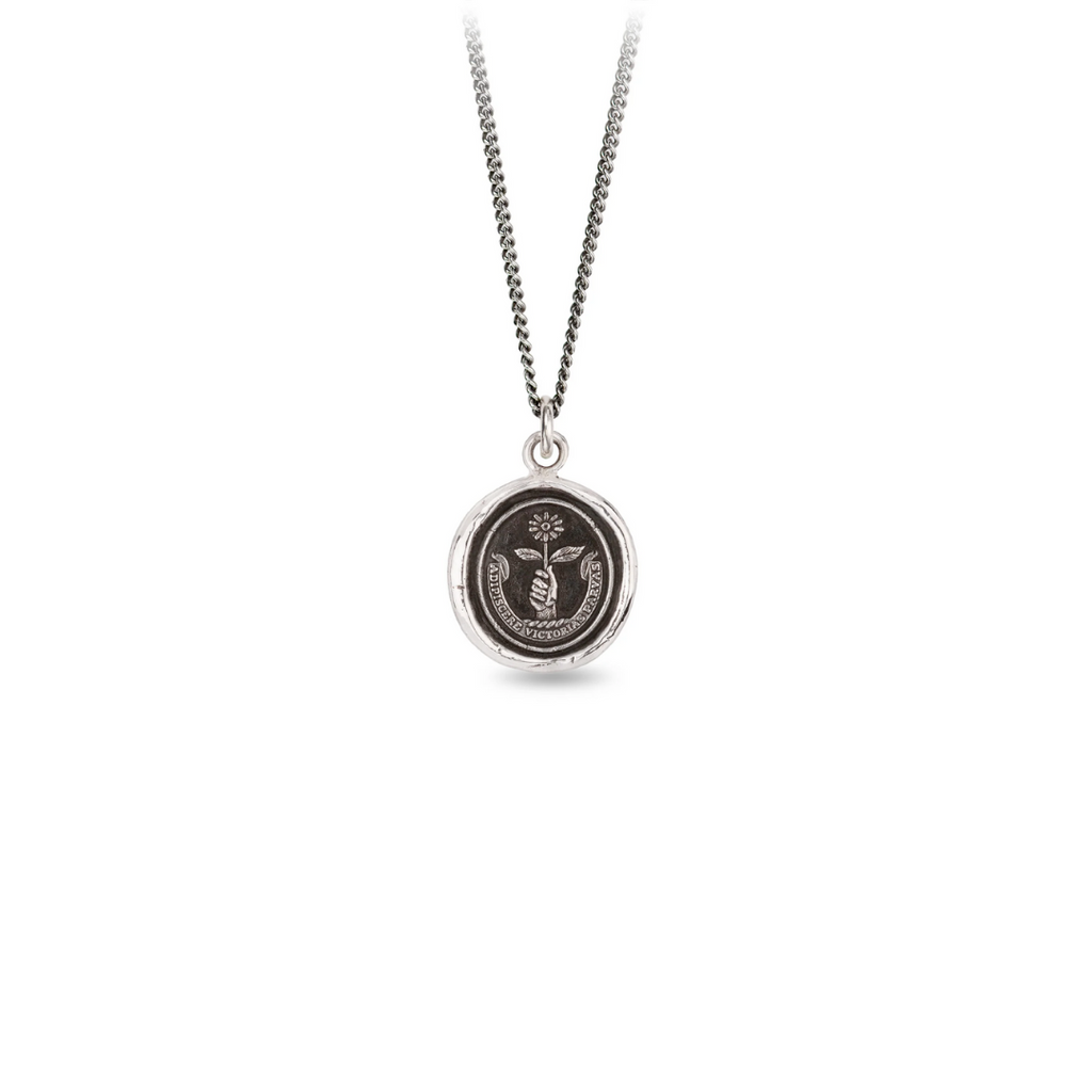 Cast using authentic wax seals and imagery from the Victorian Era, Pyrrha talismans are designed to inspire the wearer with its heralded meaning. This talisman harnesses the power of small wins to give us the confidence to keep striving toward our larger goals. Beneath the image of a daisy held aloft, the Latin emblem 'Adipiscere Victorias Parvas' encourages us to 'Pursue Tiny Victories'. Sustainably cast in 100% recycled sterling silver, the pendant measures 0.75 x 0.70" and comes on an 18" sterling silver curb chain. Comes with a letterpress meaning card (handmade from recycled materials) and a black cotton Pyrrha pouch. Lovingly handcrafted in Vancouver, Canada.