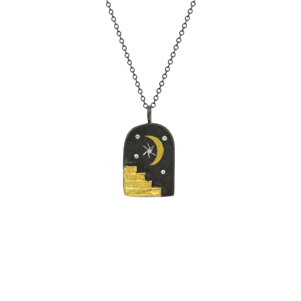 Featuring diamond-studded stars, a crescent moon, and gold stairwell, this To The Stars Pendant by Acanthus possesses a transcendental quality. Both the jewelry's edgy style and organic aesthetic lend themselves to the piece's unique and mysterious vibe. Using an ancient Korean gilding technique, this necklace is made of oxidized sterling silver and 24k yellow gold. Since the 24ky accents are hand cut and hand placed, variations may occur. The pendant measures 0.56” wide and 1” tall. The oxidized chain can be worn at 16” and 18”. Handcrafted in US.
