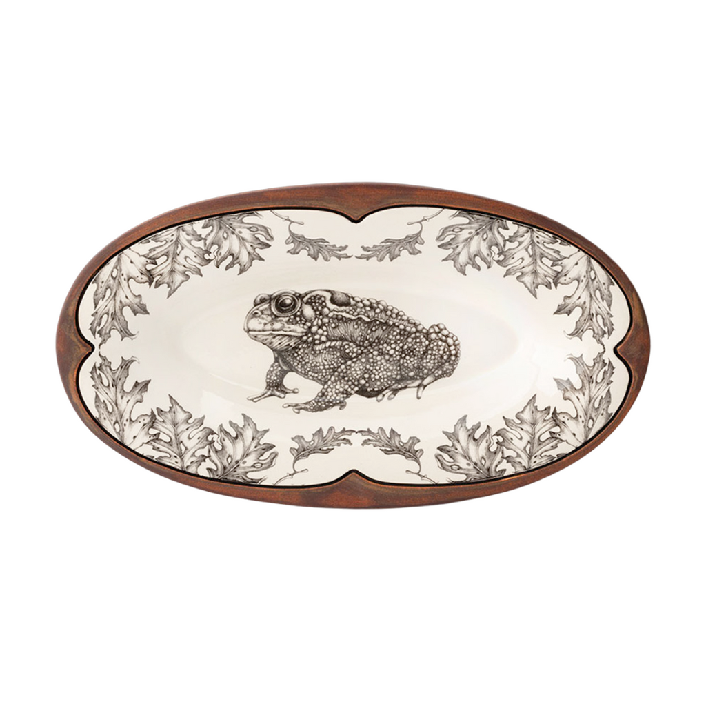 Welcome to the charm and serenity that is nature into your home with a beautiful Laura Zindel piece! Both functional and decorative, this bowl with brown accent color adorns the artist's original illustration of a toad. Made from earthenware and glazed with non-toxic, low-fire glazes. Handcrafted in US. Hand wash only they are not to be placed in the dishwasher, oven, or microwave. Measures 6.5 x 12 x 1.5 inches.