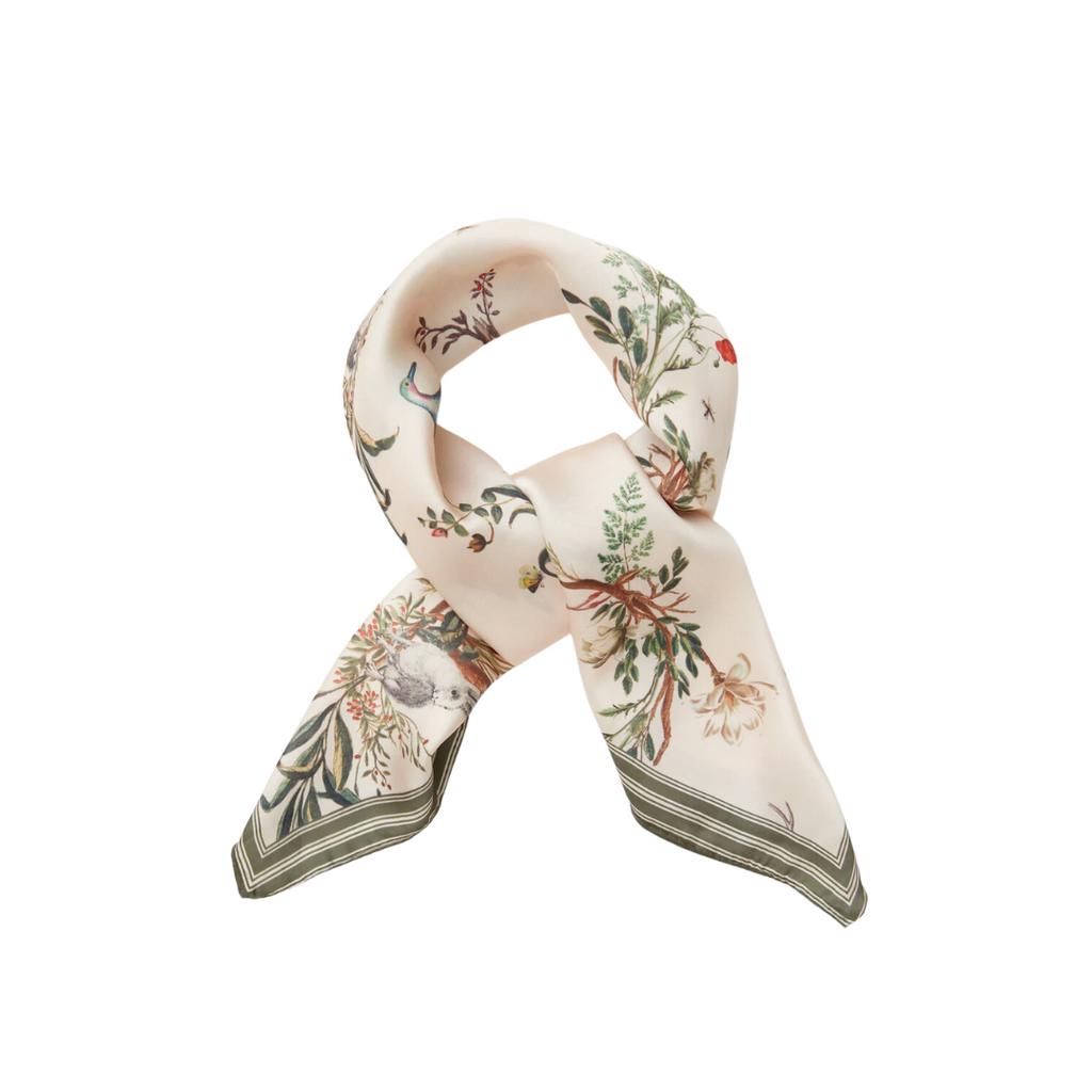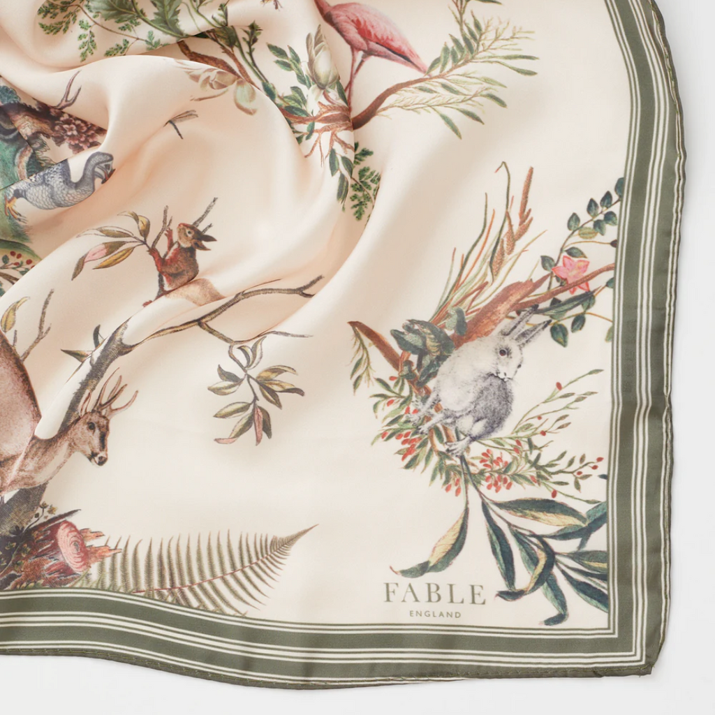 Welcome to the charming world of Fable England! Inspired by vintage botanical illustrations and Fable's 'Wonderland' theme, this ultra soft olive green and cream square scarf is decorated with an enchanting scene with sweet botanicals and woodland creatures! Wear it as a scarf or tie it around a bag handle. Measures 27.5" x 27.5". Made with polyester. Limited Edition. Handwash only.