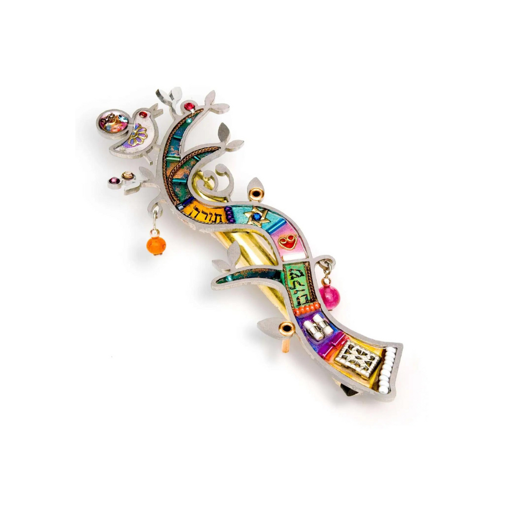 This Tree of Life mezuzah by Seeka Jewelry and Judaica is not only a ceremonial object, but a miniature work of art! The stainless steel frame is hand-painted and filled with a variety of materials, including semi-precious gemstones and Swarovski crystals, and encased in acrylic resin. Can be mounted indoors or outdoors under an overhang. Measures 5" x 2". Handcrafted in US.