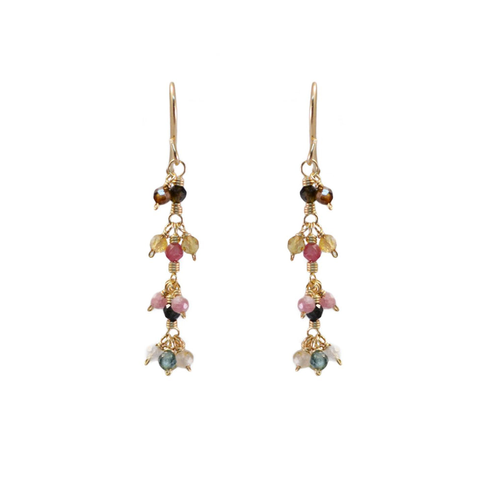 Elegant handcrafted wire wrapping meets colorful gemstones in Lina Tsui jewelry. These earrings are made of 14k yellow gold fill wire, tourmaline, and gold filled ear wires, and measure 1.5 x 0.25 inches. Handcrafted in US.