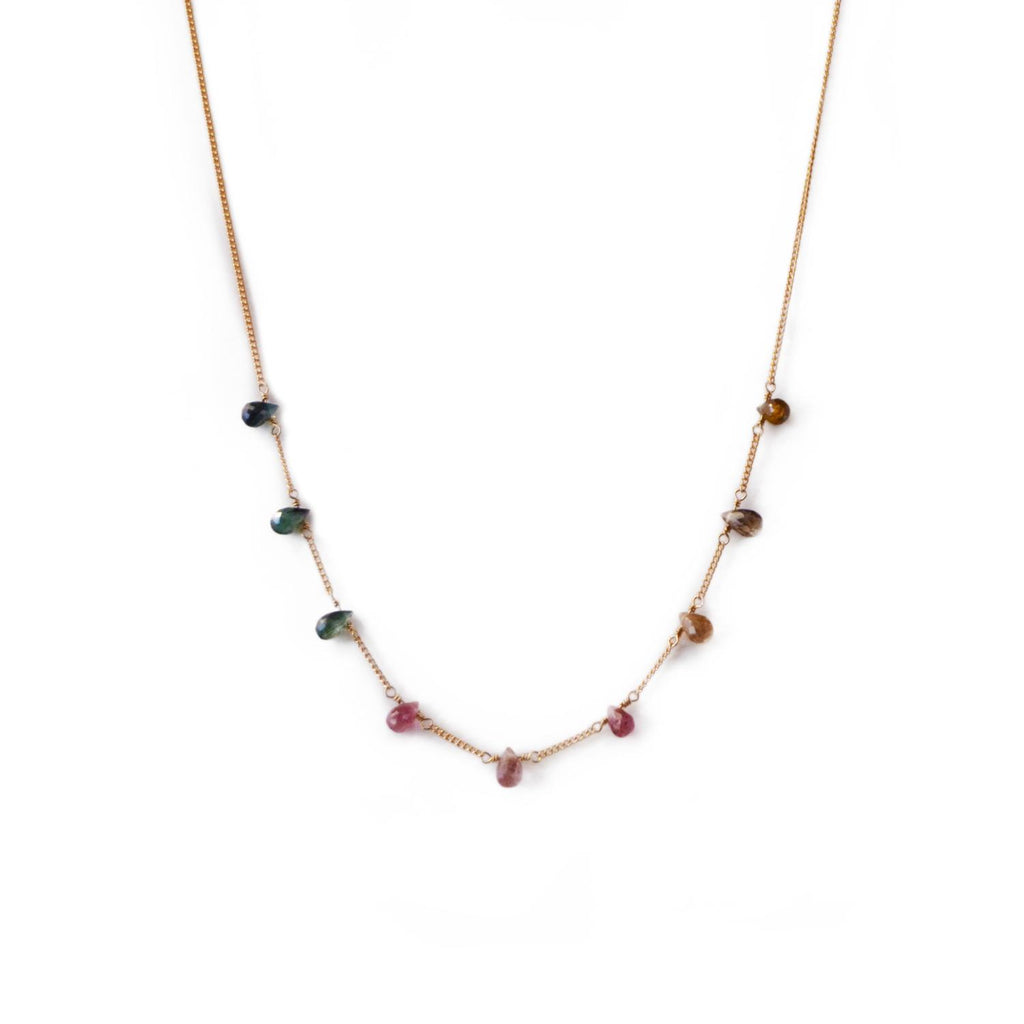 Elegant handcrafted wire wrapping meets colorful gemstones in Lina Tsui jewelry. This necklace is made of 14k yellow gold fill wire and multi color tourmaline briolettes, and measures approximately 4.5 inches across. Adjustable 14ky gold fill chain can be worn at 15.75/16.5/17.5 inches. Handcrafted in US.