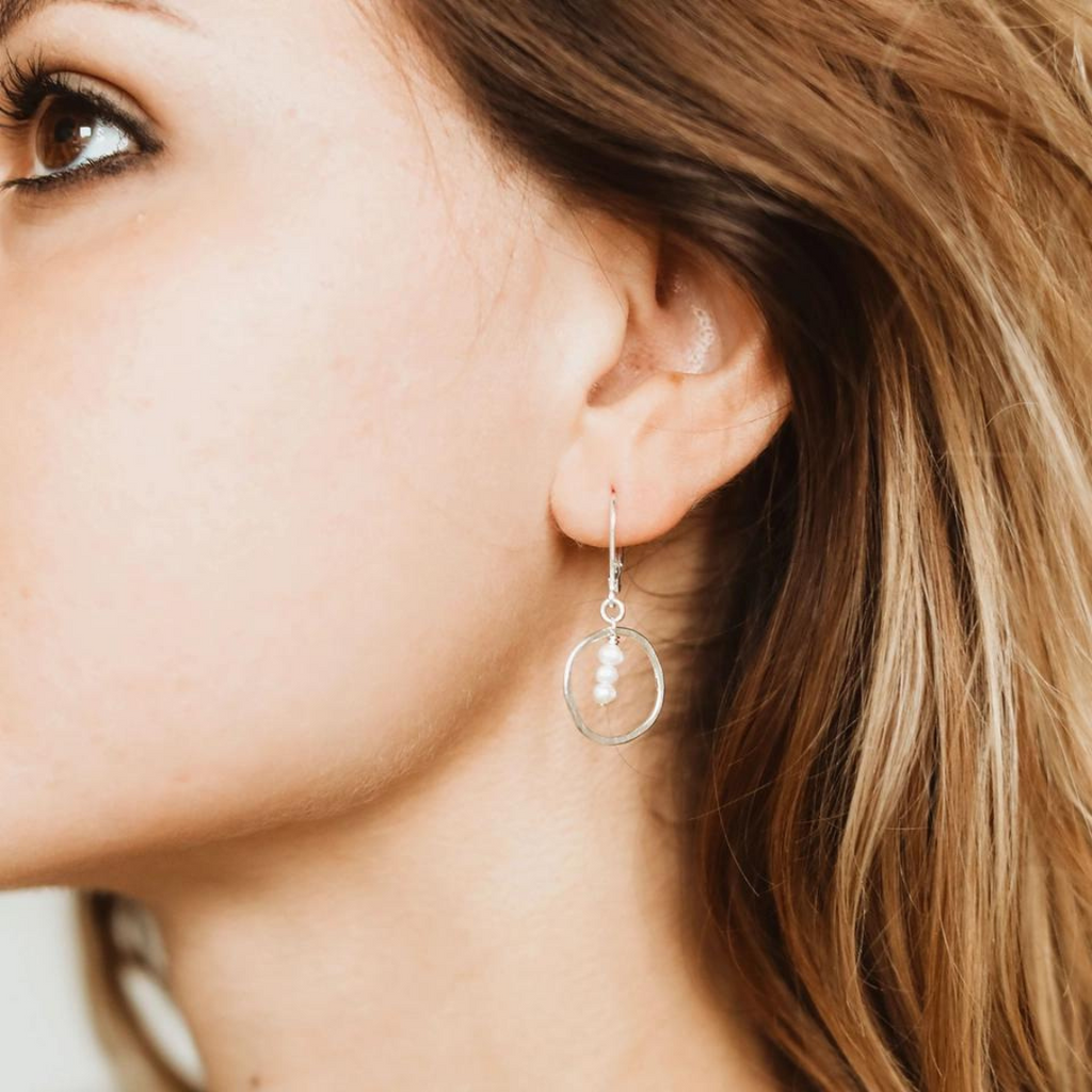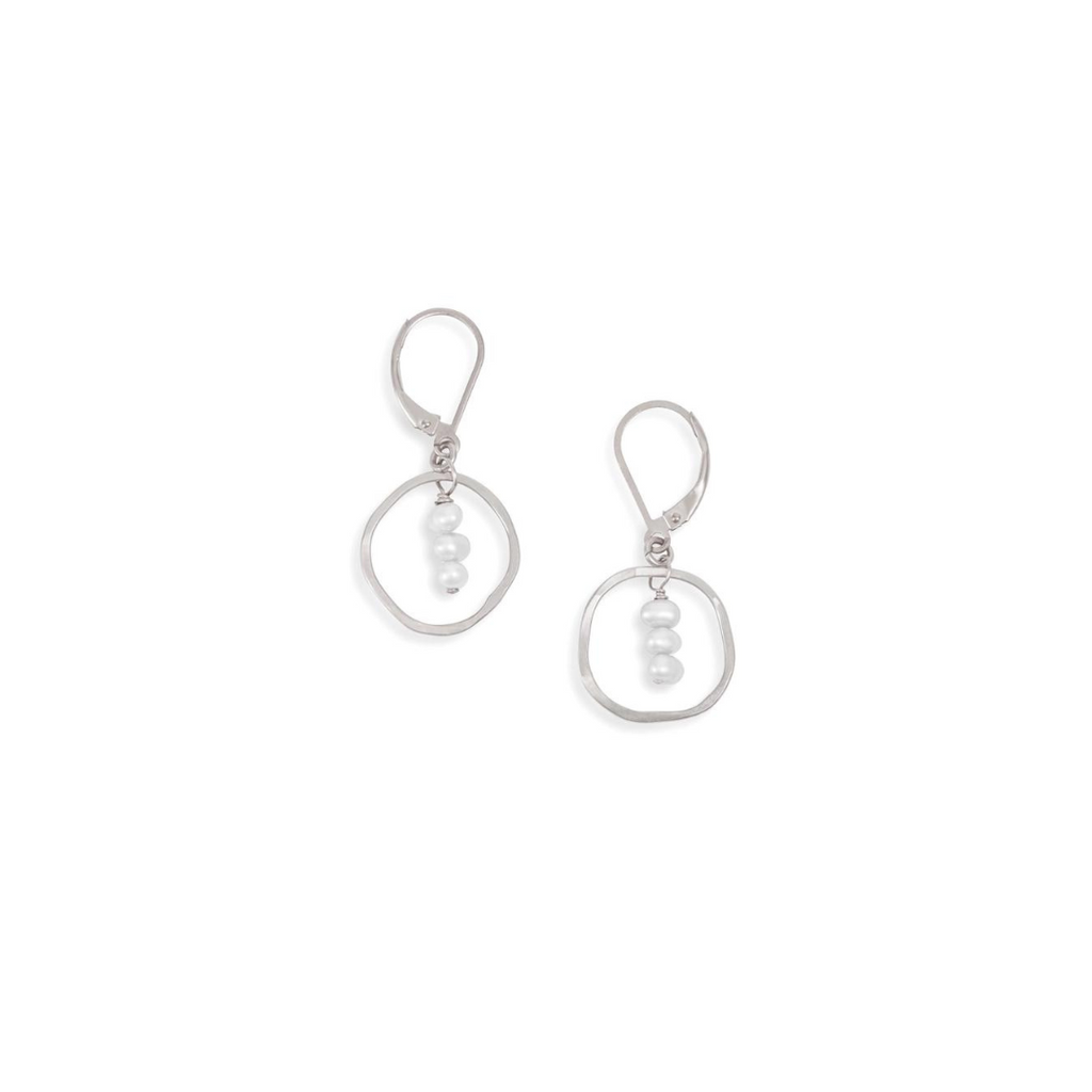 Minimalism at its best, these sterling silver earrings by Freshie & Zero are light, sexy, and great for everyday wear! The earrings feature a row of 3 small white freshwater pearls that are surrounded by a hand hammered organic circle suspended on lever backs. The earrings measure 1.38" from the top to bottom and 0.75" wide. Handmade in US.