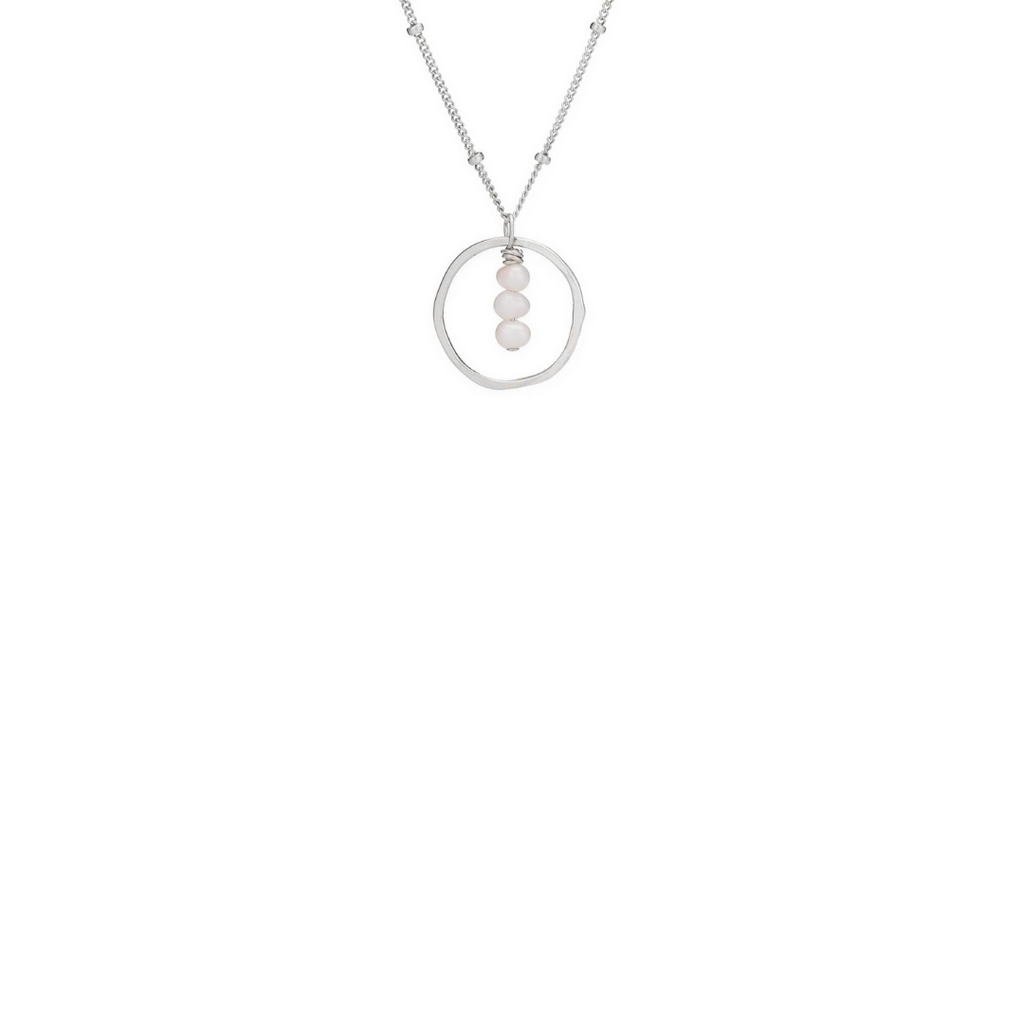Minimalism at its best, this sterling silver necklace by Freshie & Zero is light, sexy, and great for everyday wear! The pendant features a row of 3 small white freshwater pearls that are surrounded by a hand hammered organic circle. The pendant is accompanied by a beautiful dotted 16" stering silver chain. The pendant measures 0.75" in diameter. Handmade in US.