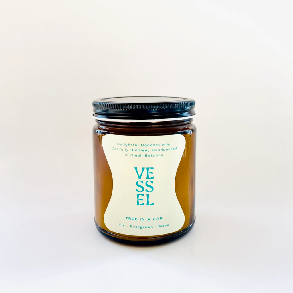 Fir, balsam and cedarwood blend with top notes of citrus and a base of amber and moss. We've captured the quintessential "tree" smell that will have you feeling all the seasonal feels in this Tree in a Jar candle by Vessel Candle Co. Burn time is up to 50 hours. Made of 100% soy wax with a lead-free cotton wick. Handpoured into amber glass jars with a gold lid, this candle will bring style and beautiful scent to any area in your home. Handmade in US.