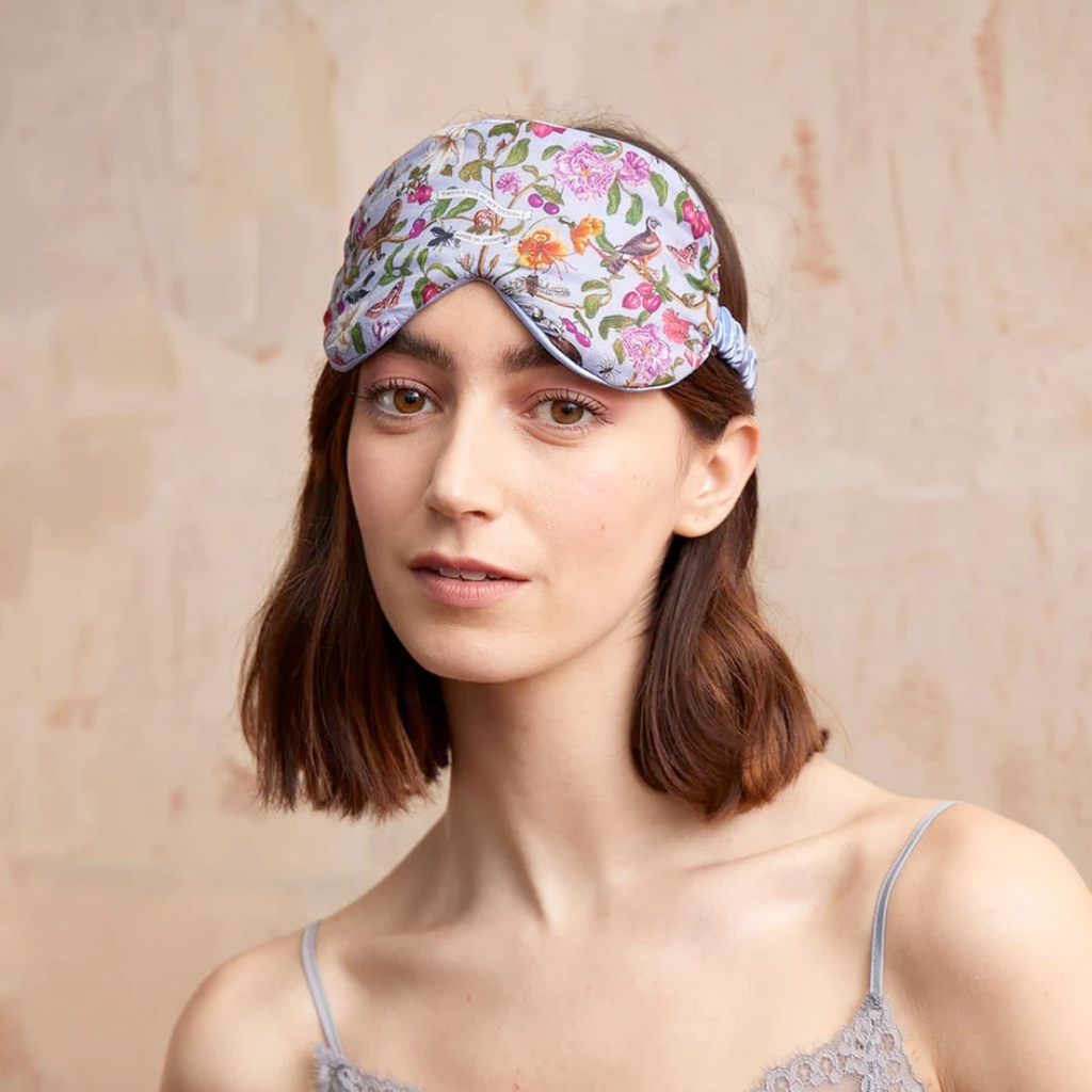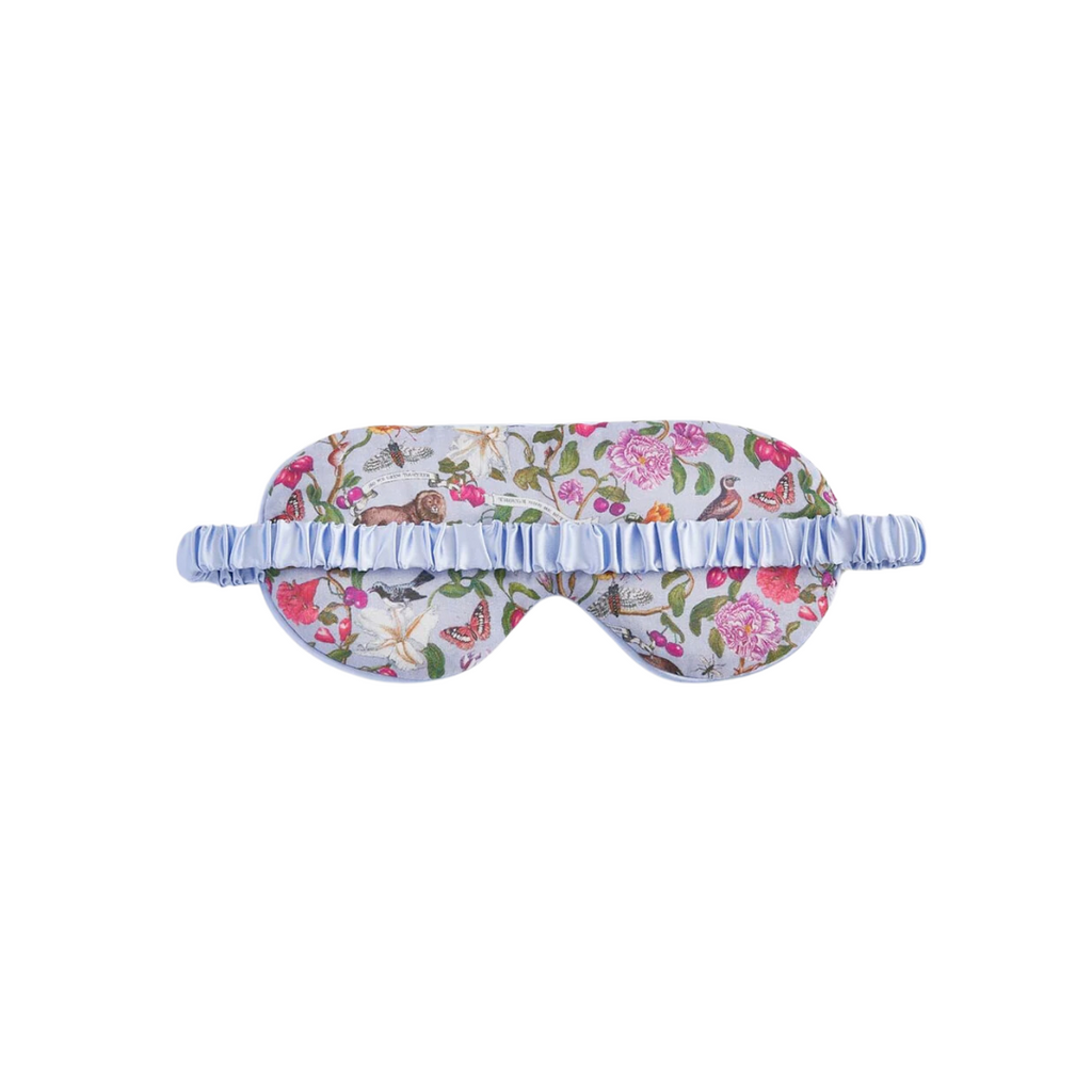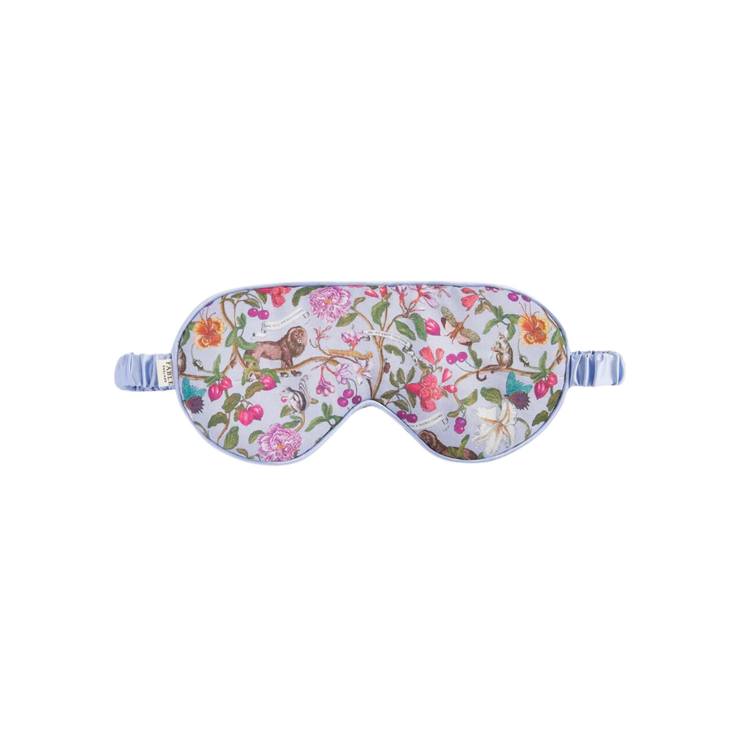 Welcome to the charming world of Fable England! Featuring Fable's Tree of Life print, this super soft eye mask will have you having sweet dreams! A touch of luxury for your sleeping hours, so you can wake up refreshed. Made from premium viscose satin and trimmed with blue piping. Comes with a sweet little matching pouch, so you can take it with you wherever you go. One size only. Elastic headband in the back.