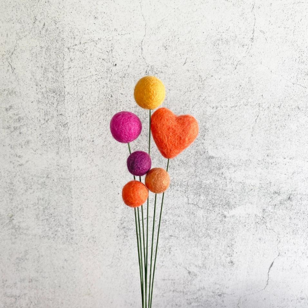 This felted wool heart ball small bouquet by Oakwind Hollow is the perfect bouquet that will last season after season! Includes 6 stems, 1 heart and 5 balls of varying colors, and is made from felted wool and green cloth covered floral wire measuring 16" tall. The floral wire can easily be cut with wire cutters to arrange the felt balls at varying heights. The hearts measure approximately 1.75" and the balls measure approximately 0.75" - 1.25" in diameter. Handcrafted in US.