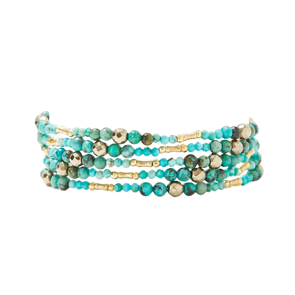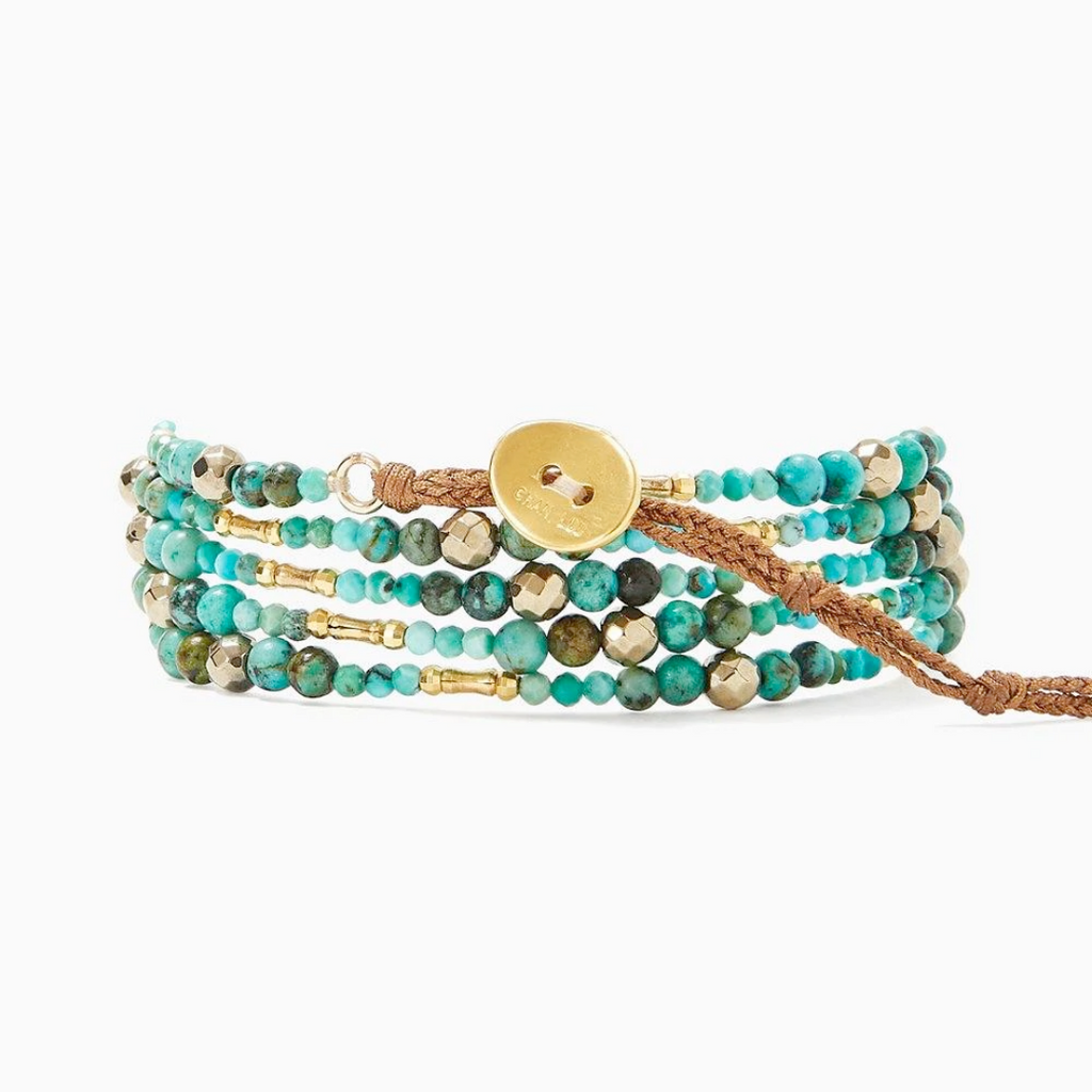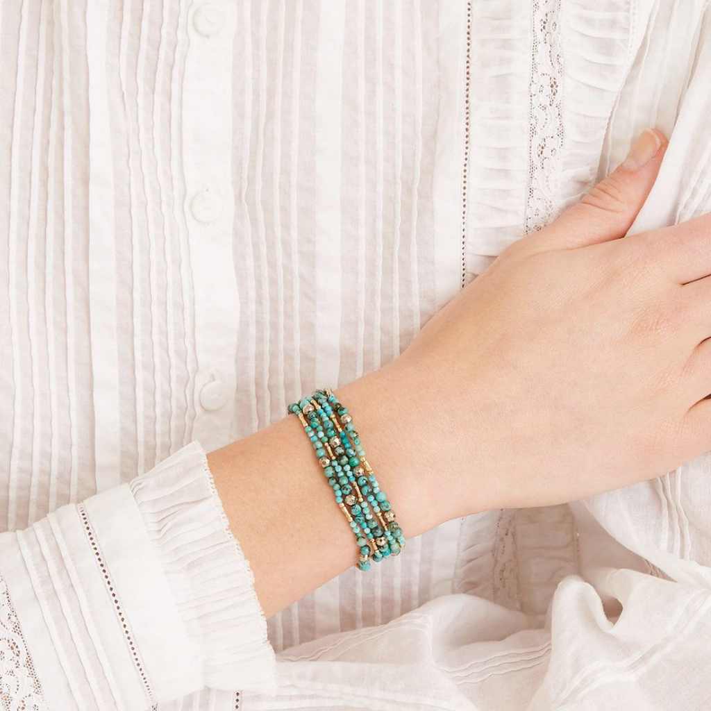Add a little bohemian flair with this naked wrap bracelet by Chan Luu! Made from a combination of turquoise, pyrite, and gold beads, this piece can be worn as both a wrap bracelet and a necklace (single or doubled). Measures 32"-34" with an adjustable 18k yellow gold plated over sterling silver oval button. The stones are approximately 0.125" each. Strung on nylon. Handmade in Vietnam.
