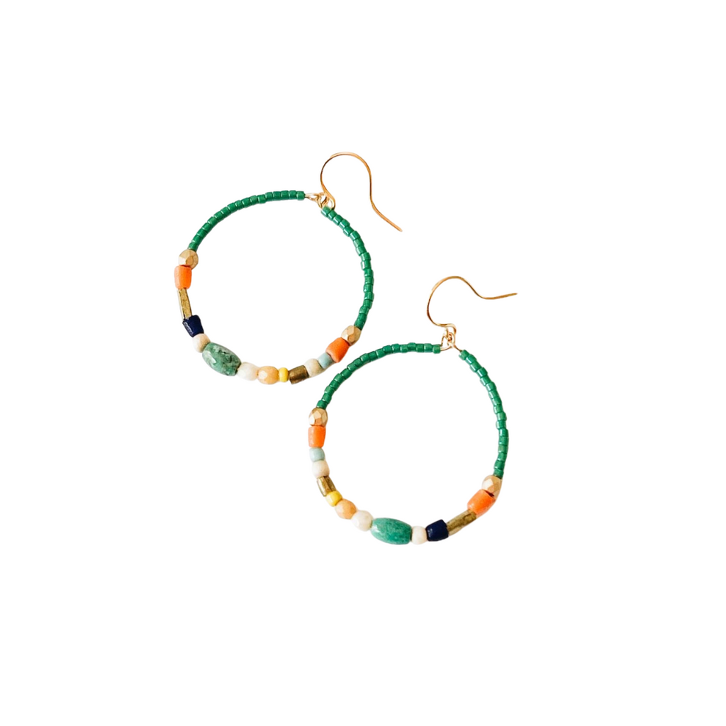 Add a pop of color and joy to your daily jewelry ensemble with these Beaded Dangle Hoops by Nest Pretty Things. The hoops measure 1.25" in diameter and are made with turquoise beads, glass & brass beads, and hang from gold plated wires. Handcrafted in US.