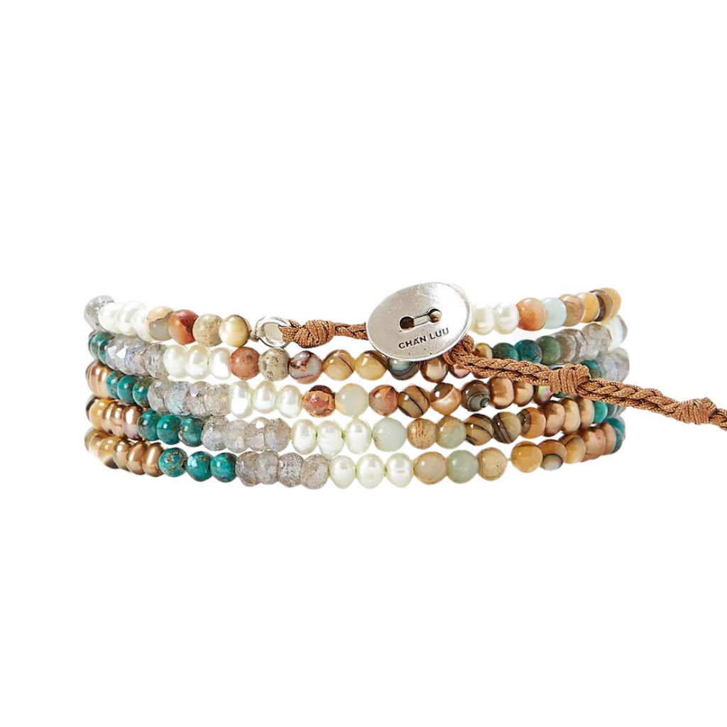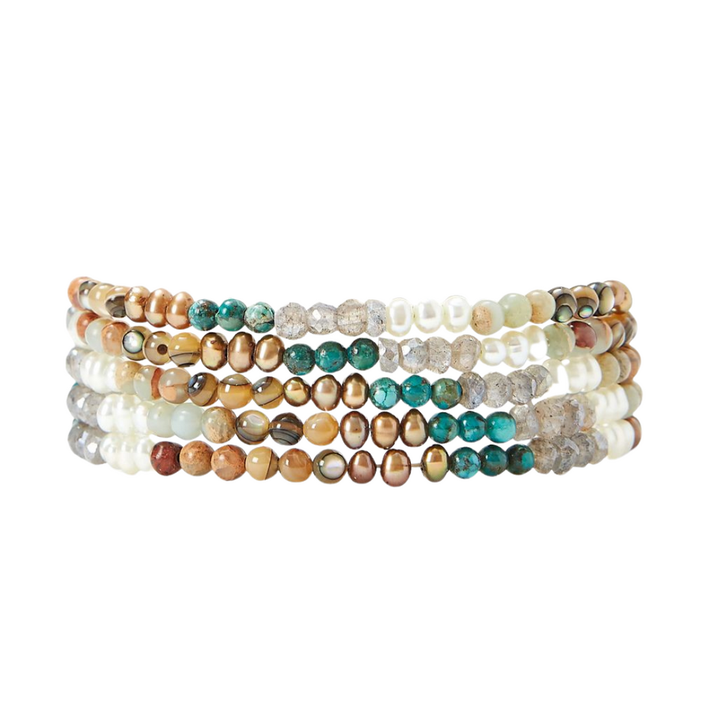 This piece can be worn both as a 5 layer wrap bracelet and a necklace. With an earthy mix of white pearl, aqua terra jasper, abalone shell, turquoise, labradorite and bronze pearl, the piece measures 34" (adjustable from 32"-34") with a sterling silver signature oval button closure. Handmade in Vietnam.