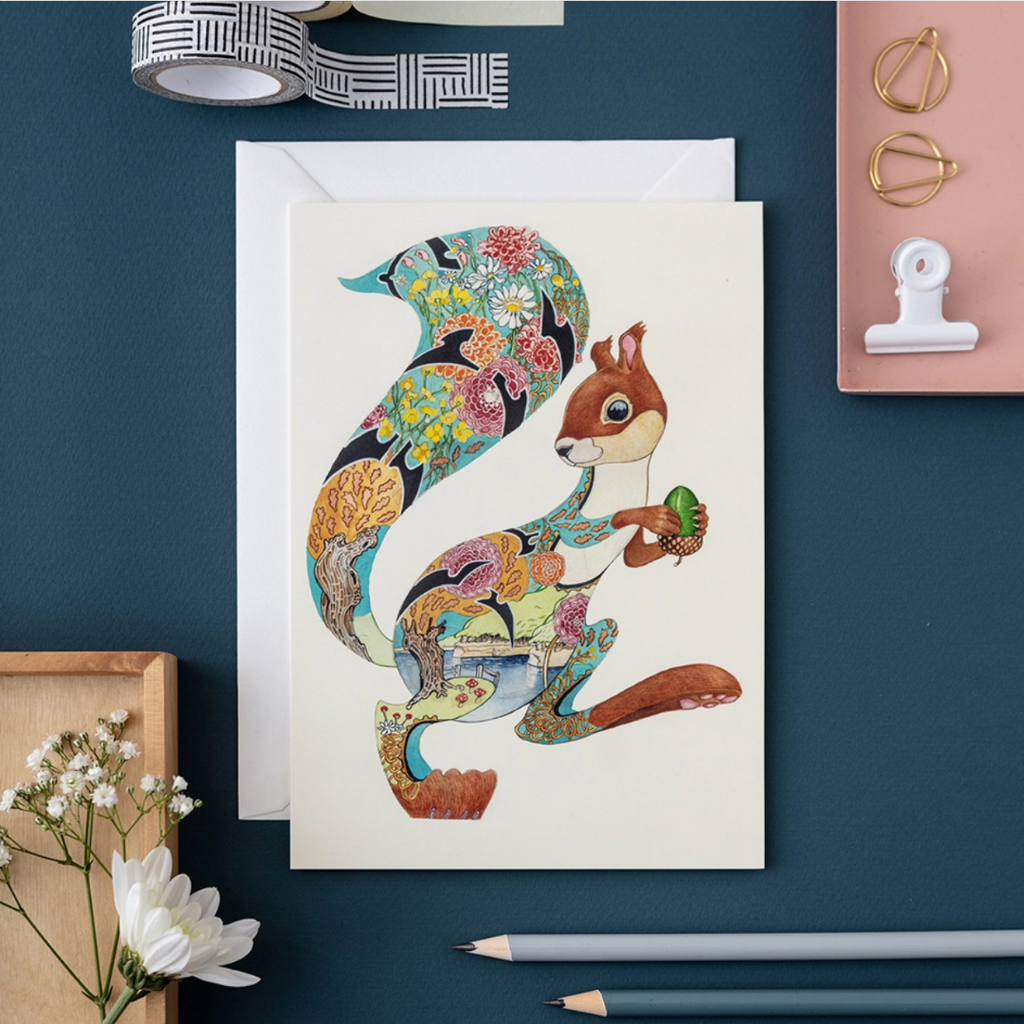 Welcome to the magical world of award-winning artist Daniel Mackie and his animal illustrations! This Turquoise Squirrel greeting card measures 7" x 5" and is printed on 300gsm board. The blank card comes with an envelope and is protected in a cello bag. Made in London.