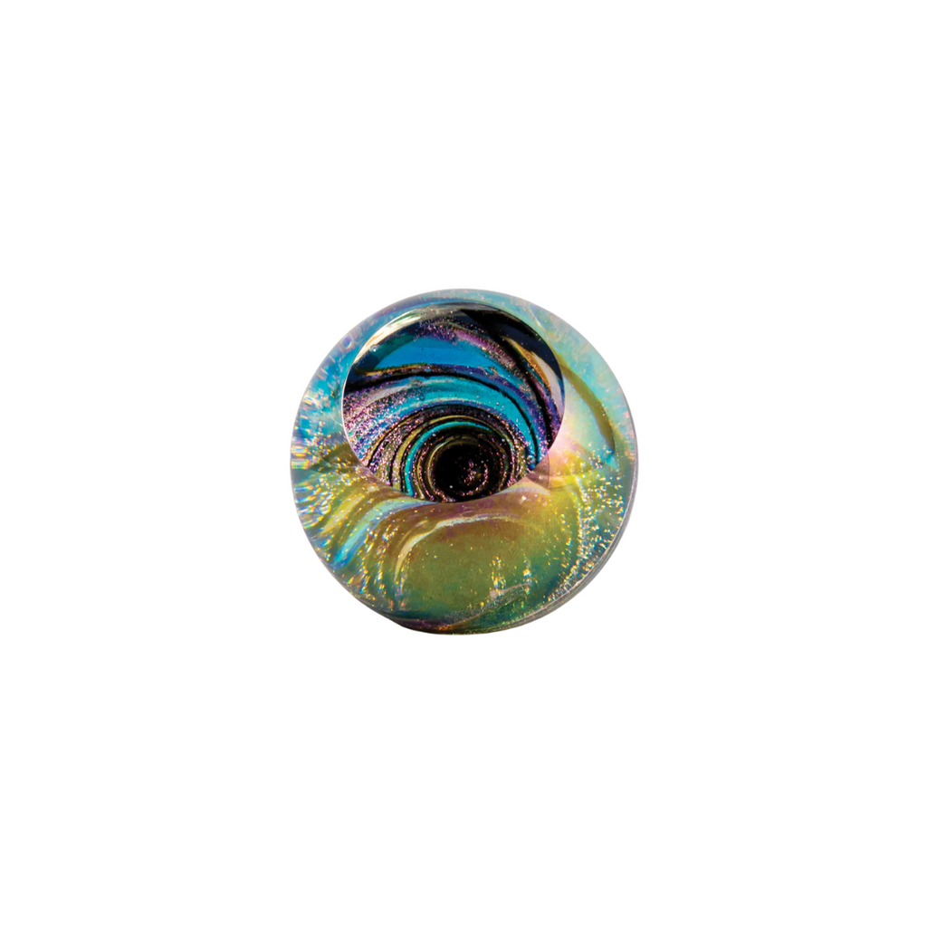 This paperweight from Glass Eye's fireballs collection is hypnotic! With vivid, sparkling colors, it's perfect for the paperweight collector or for someone who appreciates an amazing handblown glass piece. Measures approximately 2" in diameter with a flat bottom. The top of the paperweight is cut to enhance its inner spiral. Handmade in US.