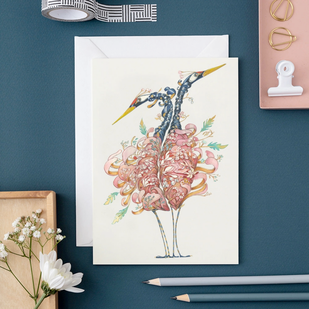 Welcome to the magical world of award-winning artist Daniel Mackie and his animal illustrations! This Two Cranes note card measures 7" x 5" and is printed on 300gsm board. The blank card comes with an envelope and is protected in a cello bag. Made in London.