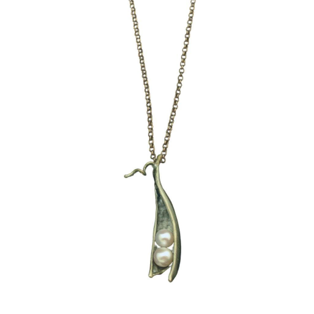 Behold nature and all its charm with this pea pod necklace by Silver Seasons. Made by creating molds directly from botanical elements, artist Michael Michaud effortlessly captures both the beauty and details of the actual flora. Made with white freshwater pearls and cast bronze with a soft green patina. The pendant is approximately 1.5” tall and 0.25” at the widest. The chain is adjustable from 16”-18”. Handmade in US.