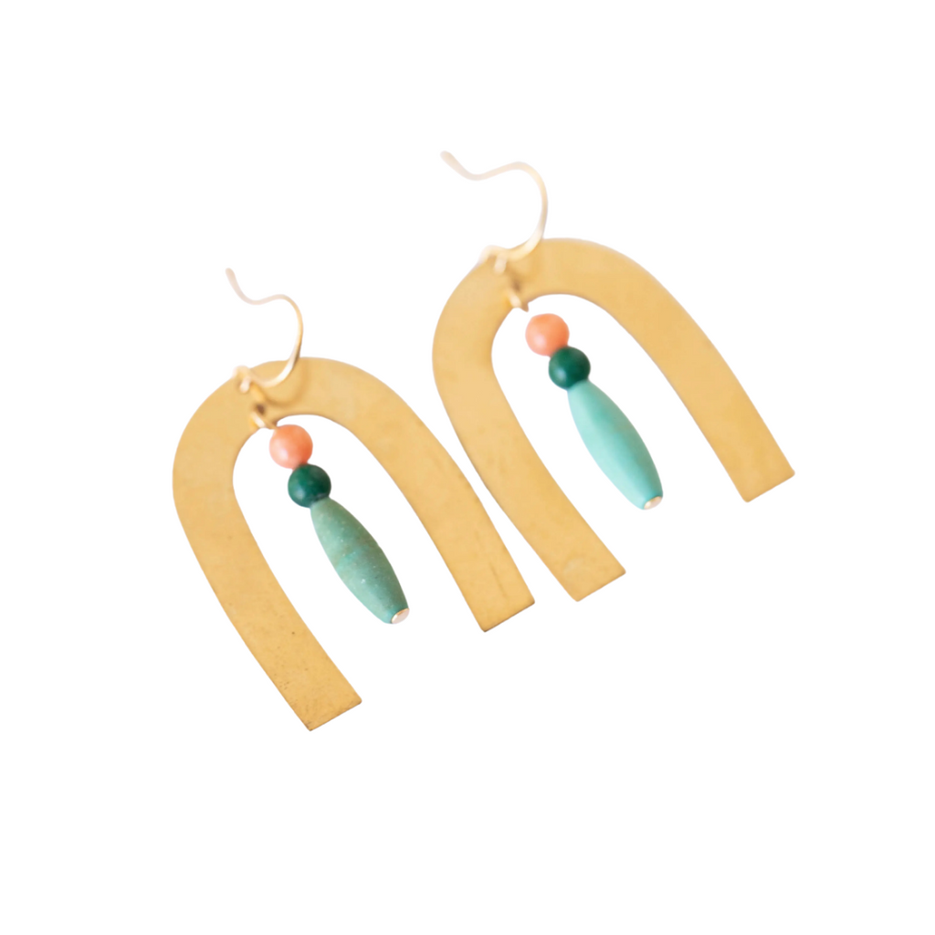 Add a pop of color and joy to your daily jewelry ensemble with these U-Shaped earrings by Nest Pretty Things. These earrings measure 1.5" long and are made with dyed Jade, Magnestie, and Coral beads, brass, and 24k gold plated earwires. Handcrafted in US.
