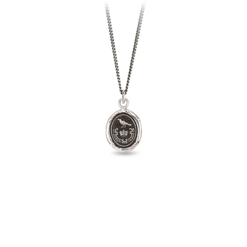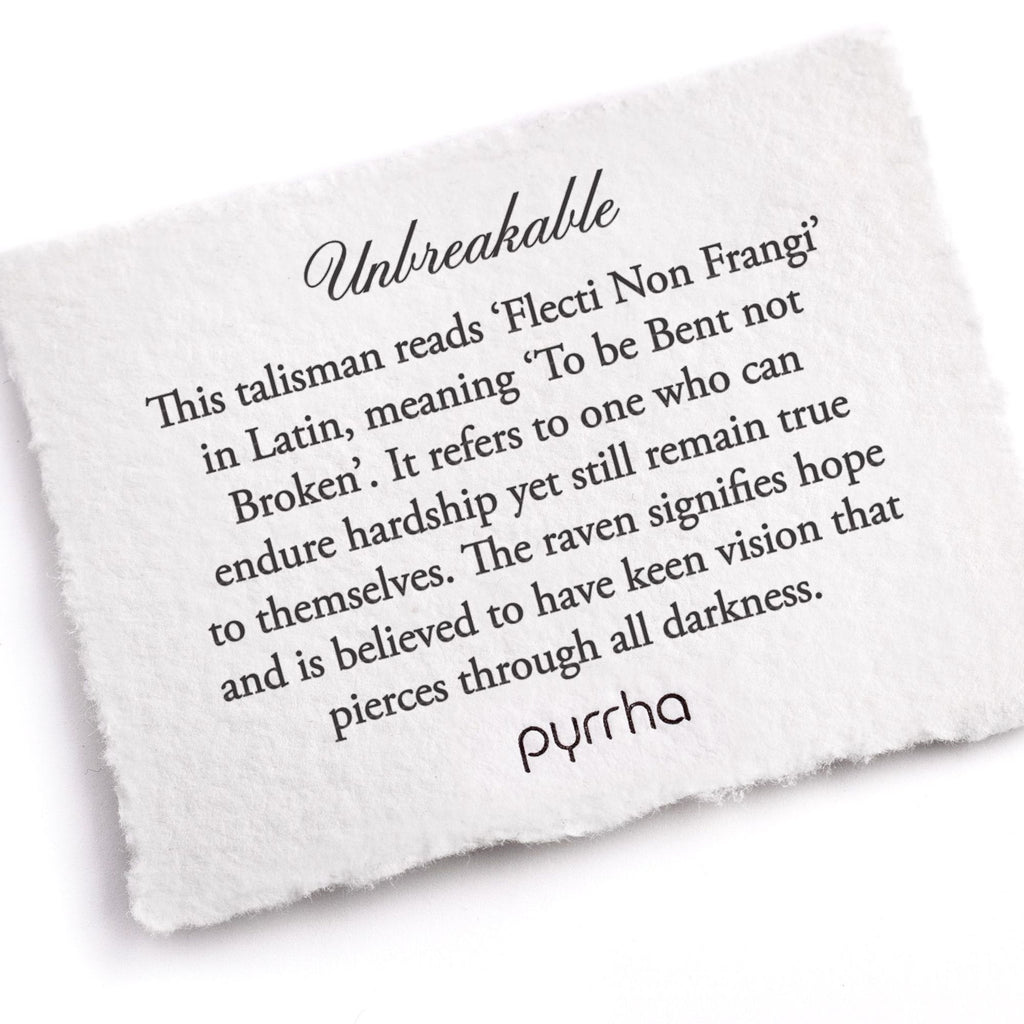 Cast using authentic wax seals and imagery from the Victorian Era, Pyrrha talismans are designed to inspire the wearer with its heralded meaning. This talisman reads 'Flecti Non Frangi' in Latin, meaning 'To be Bent not Broken'. It refers to one who can endure hardship yet still remain true to themselves. The raven signifies hope and is believed to have keen vision that pierces through all darkness. Sustainably cast in 100% recycled sterling silver, the pendant measures 0.62" x 0.74" and comes on an 18" sterling silver curb chain. Comes with a letterpress meaning card (handmade from recycled materials) and a black cotton Pyrrha pouch. Lovingly handcrafted in Vancouver, Canada.