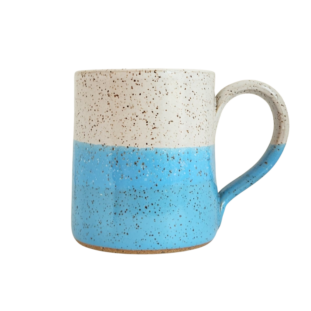 Enjoy your favorite tea or coffee in this bright, cheerful ceramic mug by Barbarah Robertson Pottery! Handmade from speckled stoneware clay, the mug has a beautiful blue and white shiny glaze color palette. Measures approximately 3.25" wide (not including the handle) and 4.5" tall. Microwave and dishwasher safe. Due to its handmade process, the mugs all have natural and unique imperfections. No two are exactly alike. The glaze colors, reactions, and design of the item received may differ from the photo.