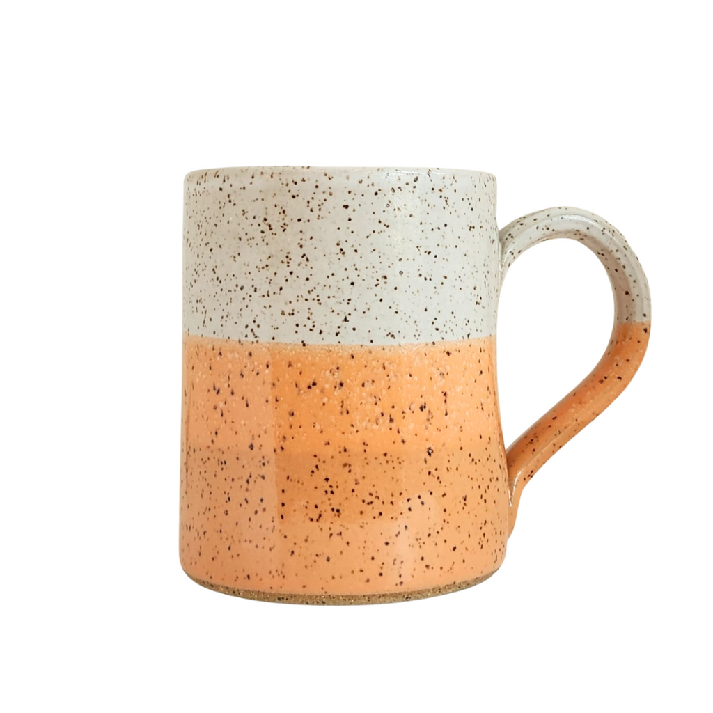 Enjoy your favorite tea or coffee in this bright, cheerful ceramic mug by Barbarah Robertson Pottery! Handmade from speckled stoneware clay, the mug has a beautiful tangerine and white shiny glaze color palette. Measures approximately 3.25" wide (not including the handle) and 4.5" tall. Microwave and dishwasher safe. Due to its handmade process, the mugs all have natural and unique imperfections. No two are exactly alike. The glaze colors, reactions, and design of the item received may differ from the photo.
