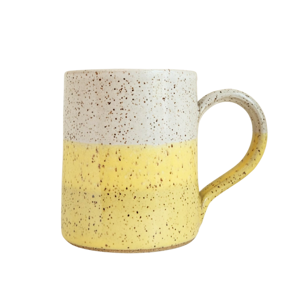 Enjoy your favorite tea or coffee in this bright, cheerful ceramic mug by Barbarah Robertson Pottery! Handmade from speckled stoneware clay, the mug has a beautiful yellow and white shiny glaze color palette. Measures approximately 3.25" wide (not including the handle) and 4.5" tall. Microwave and dishwasher safe. Due to its handmade process, the mugs all have natural and unique imperfections. No two are exactly alike. The glaze colors, reactions, and design of the item received may differ from the photo.