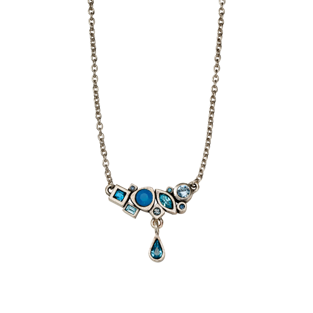 Express yourself with Patricia Locke jewelry! Made of silver plated pewter with Swarovski crystals in the color scheme Bermuda. Pendant measures 1.13" x 1" on an adjustable 16.5"-18" chain. Handmade in US. Jewelry Care: Expect some natural aging effects. Pieces should be maintained with a soft, untreated jeweler's cloth, no liquids or detergents. For best wear, keep jewelry away from moisture and put on after any lotions, hair sprays, or perfume.