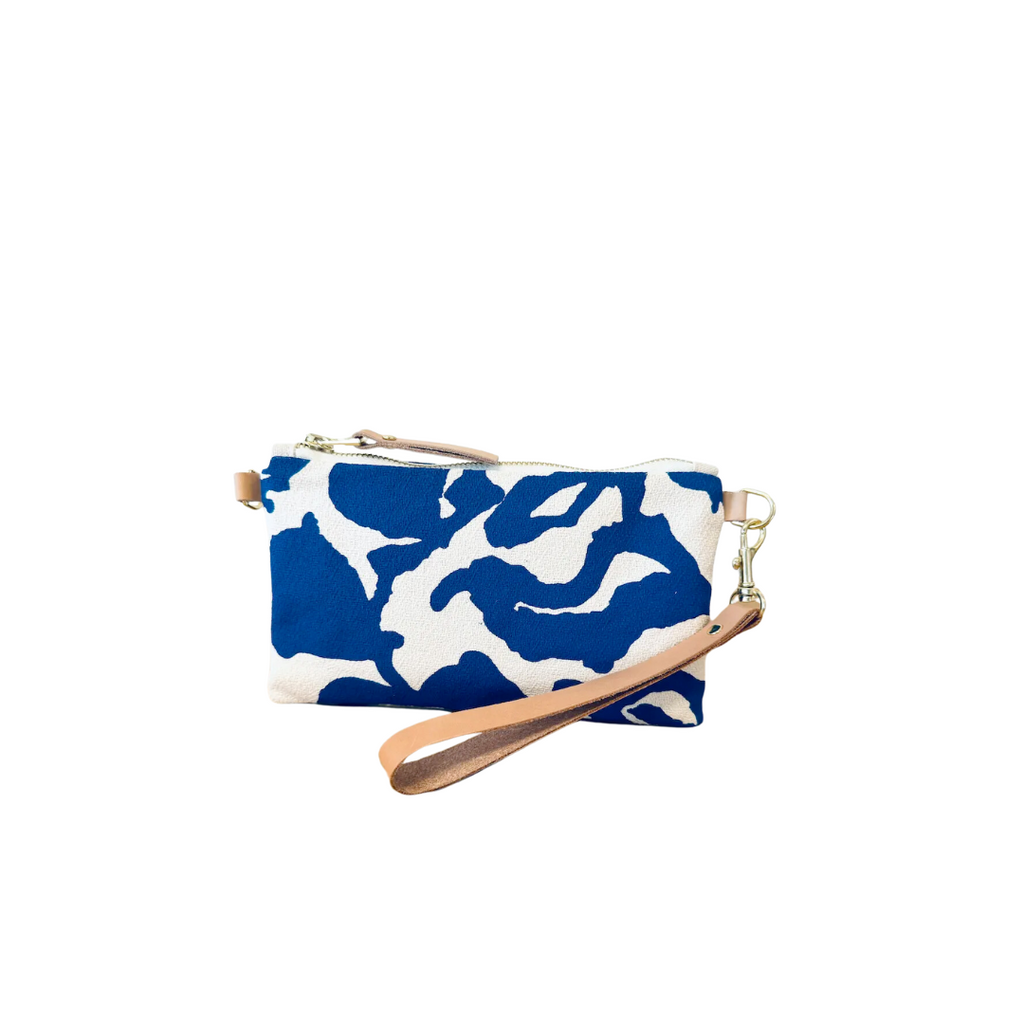 Be bold, colorful, and bring happiness to your everyday life with one of Erin Flett's fun accessories! Created from the artist's hand-drawn graphics that is screen printed, this cute bag is perfect for going out on the town! Includes a leather wristlet strap and there is an extra d-ring on the sides, so you can use an adjustable leather strap (sold separately) to wear as a crossbody bag! Made with cotton barkcloth, cotton canvas lining, brass hardware, and leather detailing. Measures 8" x 4.5" with a slip pocket inside. Machine wash cold inside out and dry flat. Handmade in US.