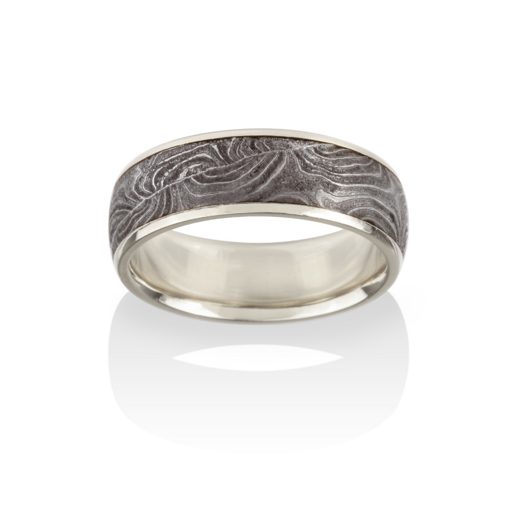 This Chris Ploof damascus ring is created from a limited edition circa 1870, Belgian-made Damascus shotgun barrel cross section with a flat profile and narrow palladium500 channel. Measures 6mm wide and is a size 10.5. Available for order in other metals, widths, and ring sizes. Please contact us at 413-586-1119 for more information.