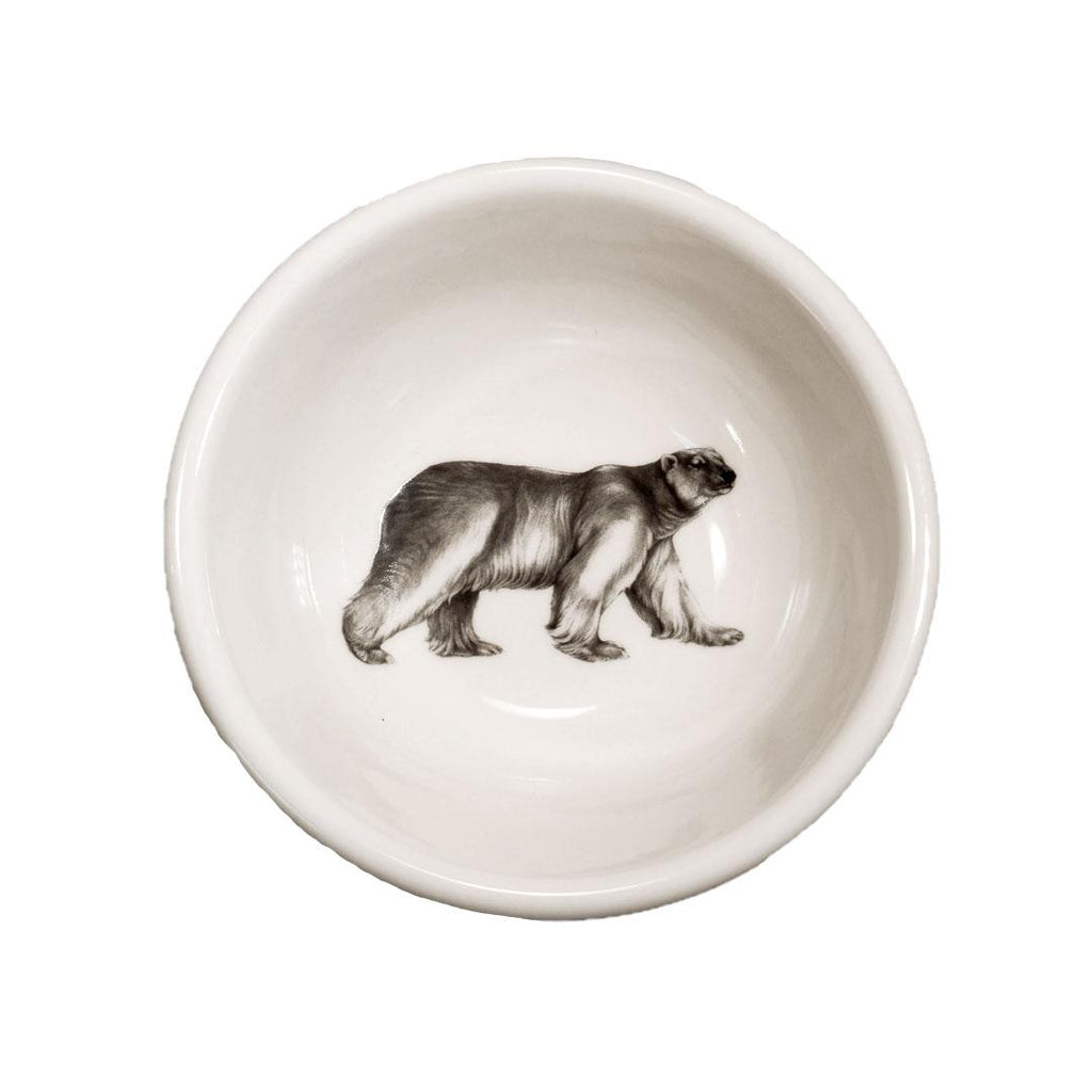 Welcome to the charm and serenity that is nature into your home with a beautiful Laura Zindel piece! Both functional and decorative, this bowl adorns the artist's original illustration of a walking bear. Made from high-resistance white china. Measures 5.5" wide and 2" deep. Microwave and dishwasher safe. Handcrafted in US.