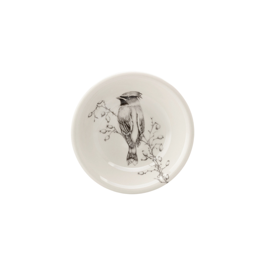 Welcome to the charm and serenity that is nature into your home with a beautiful Laura Zindel piece! Both functional and decorative, this bowl adorns the artist's original illustration of a honey bee. Made from high-resistance white china. Measures 4.75" wide and 1.25" deep. Microwave and dishwasher safe. Handcrafted in US.