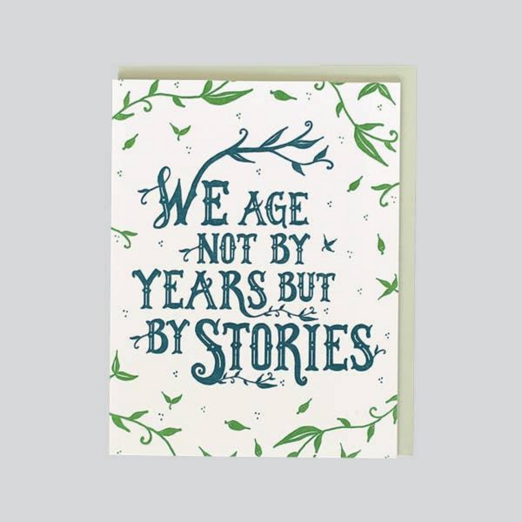Give this wonderful We Age Not By Years But By Stories birthday card by folio press and paperie! Letterpress A2 blank card printed on 140# French Muscletone paper. Measures 4.25" x 5.5". Comes with a green deep flap envelope. Handmade in US.