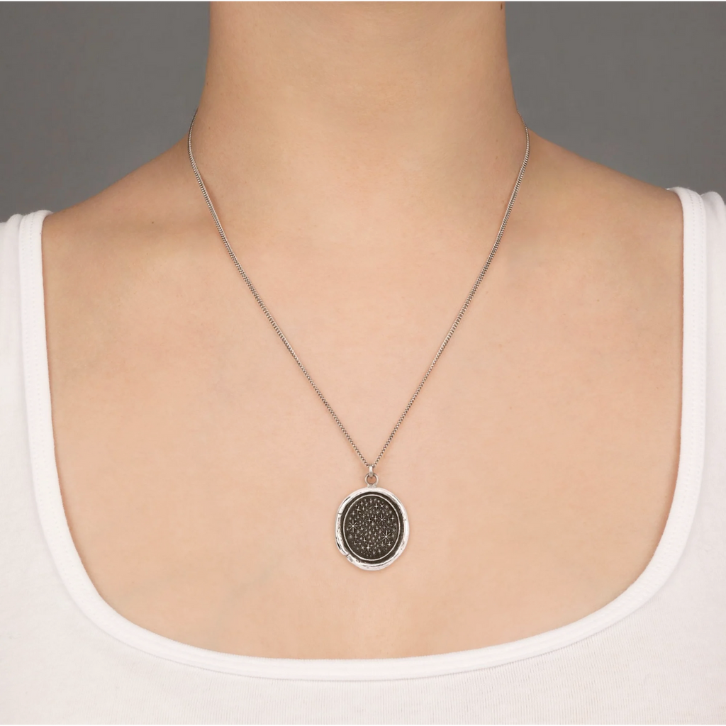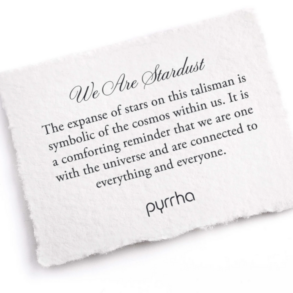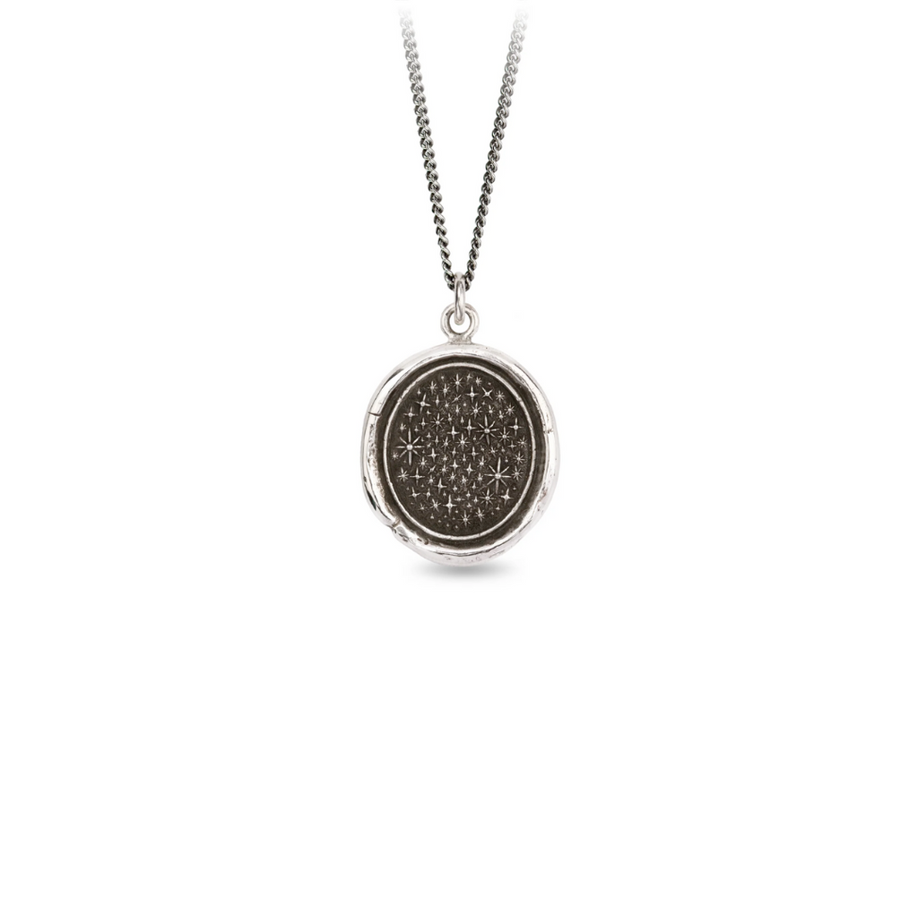 Cast using authentic wax seals and imagery from the Victorian Era, Pyrrha talismans are designed to inspire the wearer with its heralded meaning. This talisman features an expanse of stars, symbolizing the cosmos within us. It's a wonderful reminder that we are one with the universe and connected to everything and everyone. Sustainably cast in 100% recycled sterling silver, the pendant measures 0.98 x 0.86" and comes on an 18" sterling silver curb chain. Comes with a letterpress meaning card (handmade from recycled materials) and a black cotton Pyrrha pouch. Lovingly handcrafted in Vancouver, Canada.
